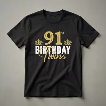 Twin siblings celebrating their 91st birthday deserve a special way to mark this incredible milestone. This graphic tee proudly displays '91st Birthday Twins' in bold white lettering with a distressed texture, accented by a shimmering gold '91' and the word 'Twins' in a flowing script. Two ornate gold crowns sit atop the design, adding a regal touch to this celebratory apparel. Reaching 91 years is a remarkable achievement, a testament to a life lived and shared, especially for twins who have experienced nearly a century of life together. This shirt is a thoughtful gift for the twin brother and sister who are celebrating this significant birthday. Imagine them wearing this t-shirt to a family gathering, a birthday brunch, or any special occasion honoring their 91 years. It's a fantastic way for them to showcase their unique bond and shared journey. This comfortable tee makes a statement and serves as a cherished keepsake for this once-in-a-lifetime celebration.