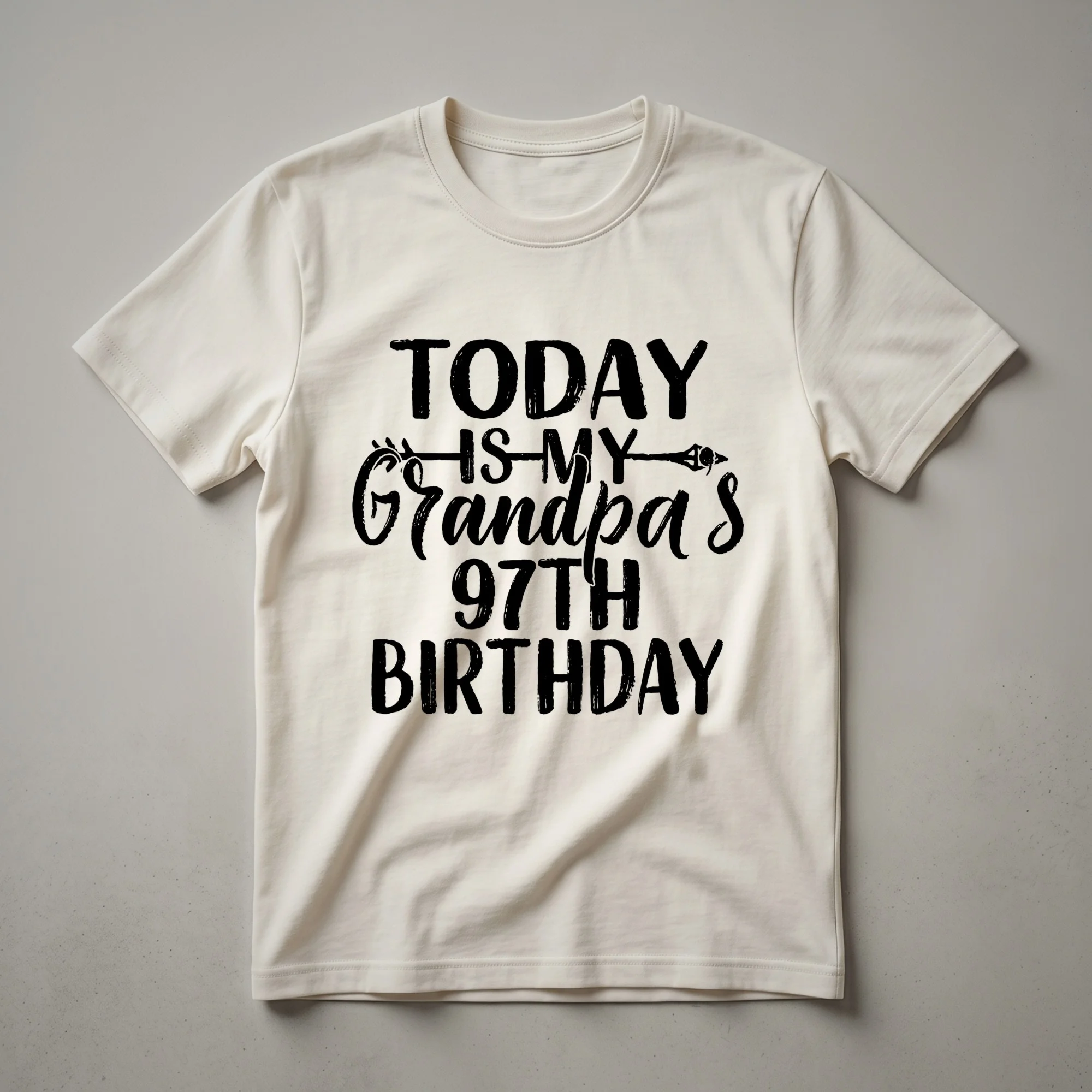 Grandpas who are celebrating their 97th birthday deserve to be recognized for reaching such an incredible milestone. This graphic tee proudly declares 'Today Is My Grandpa's 97th Birthday' in bold white lettering against a dark background, making it a clear and celebratory statement piece. Turning 97 is a remarkable achievement, placing individuals in a generation that has witnessed immense historical change and personal growth. This shirt is a fantastic way for family members to honor their grandpa on his special day, whether it's for a birthday dinner, a family gathering, or a casual celebration. It serves as a conversation starter and a visible symbol of love and respect for the patriarch. This t-shirt makes a thoughtful gift for any grandchild, child, or family friend looking to give something unique and personal. Imagine the joy on Grandpa's face when he receives this shirt, a tangible reminder of the love surrounding him as he celebrates nearly a century of life. It’s a wearable piece of memorabilia for a truly unforgettable birthday occasion, made for creating lasting memories.