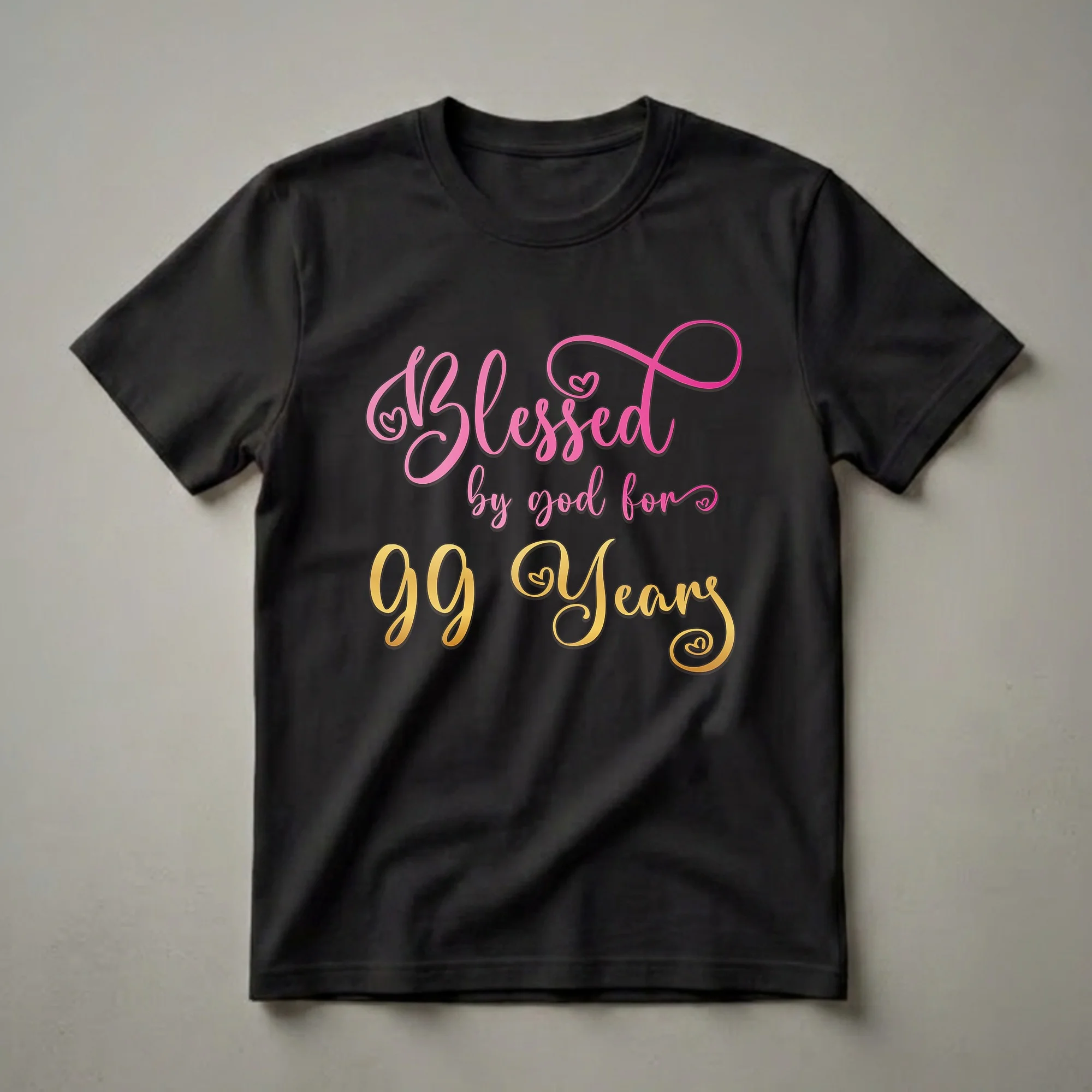 Ninety-nine years is a remarkable milestone, and this graphic tee celebrates that incredible journey. Women turning 99 will reach for this shirt to commemorate their special day. The design features elegant script text in pink and gold, proclaiming "Blessed by God for 99 Years." This eye-catching t-shirt is a wonderful way for the birthday queen to share her joy and gratitude. It makes a thoughtful gift for grandmothers, mothers, or any woman celebrating her 99th birthday. Imagine her wearing this at her birthday brunch or family gathering, radiating happiness. This shirt is a testament to a life well-lived and a blessing to all who know her. It's more than just apparel; it's a celebration of faith, family, and nearly a century of cherished memories. This special birthday shirt is a perfect way to honor her legacy and the wisdom she brings.