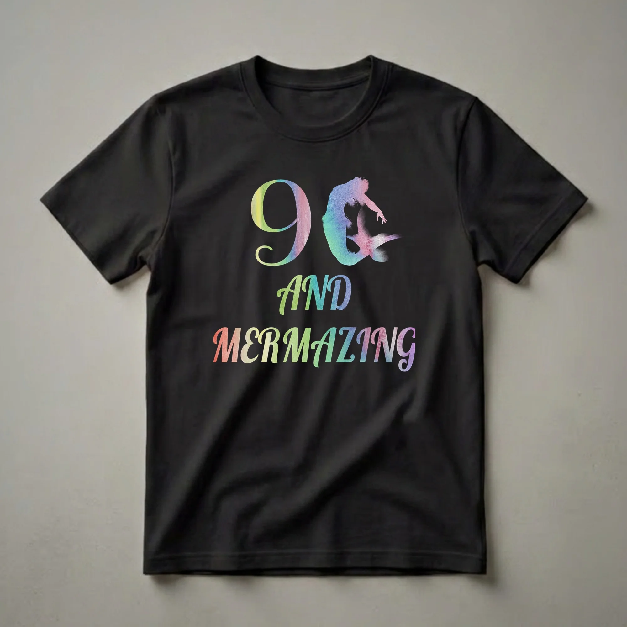 Nine-year-old girls who are celebrating a special birthday will love this "9 and Mermazing" t-shirt. The design features a large, colorful watercolor-style number '9' with a silhouette of a mermaid leaping above it. Below, the words "AND MERMAZING" are written in a playful, flowing font, also filled with a vibrant watercolor gradient. This eye-catching graphic tee is a fantastic way for a child to express their excitement about turning nine and their love for all things mermaid. It's a staple piece for any birthday celebration, whether it's a party, a family dinner, or a special outing. This shirt works well for any girl who dreams of underwater adventures and magical sea creatures. It makes a thoughtful gift for a daughter, niece, or granddaughter who is hitting this milestone age. Imagine her delight when she unwraps this unique birthday shirt, ready to wear it for her special day and beyond. This tee is a fun addition to any young girl's wardrobe, a go-to for casual wear or as a standout piece for her birthday festivities.