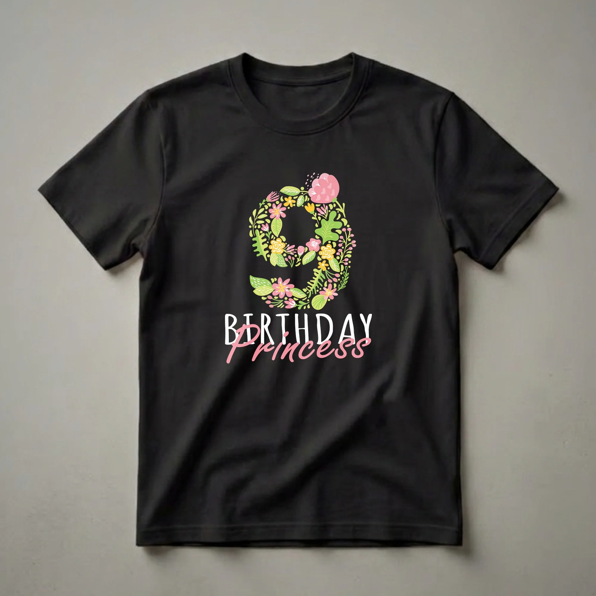 Nine-year-old girls celebrating their birthday will adore this 'Birthday Princess' tee. The design features a vibrant number 9 crafted from an assortment of colorful flowers, leaves, and delicate berries in shades of pink, yellow, and green, all set against a black background. Below the floral numeral, the words 'BIRTHDAY PRINCESS' are displayed, with 'BIRTHDAY' in white block letters and 'PRINCESS' in a playful pink script. This t-shirt is a wonderful way for a girl turning nine to feel special and celebrated on her big day. It's a thoughtful gift for any young girl who loves a touch of floral charm and princess-themed birthday celebrations. She will reach for this shirt to wear to her birthday party, family gatherings, or any occasion where she wants to showcase her royal birthday status. The cheerful floral arrangement evokes the joy and beauty of spring, making it a delightful addition to her birthday wardrobe. This graphic tee is a fun and festive choice for any 9-year-old princess.