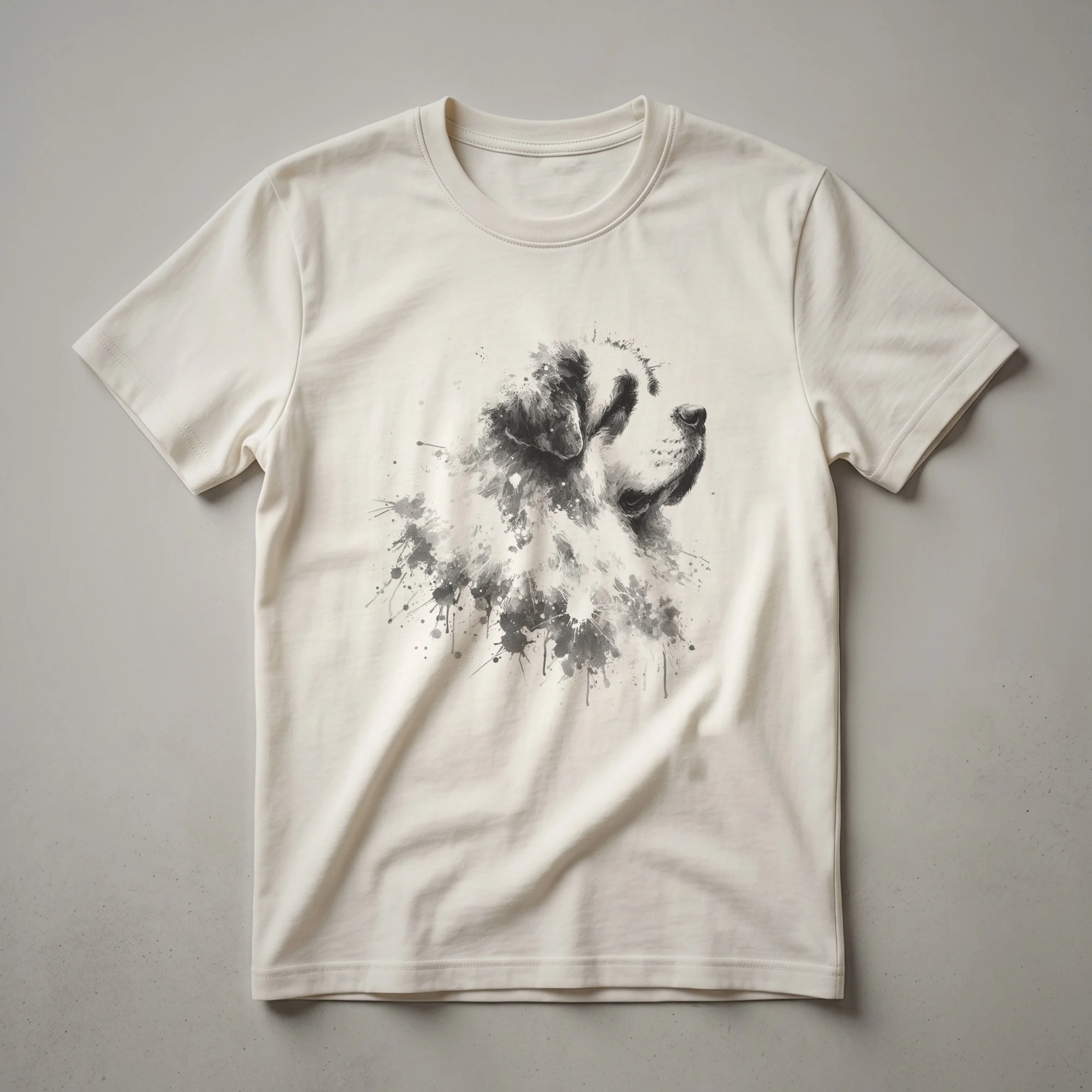 Saint Bernard owners and admirers of unique canine art will appreciate this striking t-shirt. The design features an abstract, sketch-like rendering of a Saint Bernard's face, rendered in a monochromatic style that evokes a vintage feel. Splatters of paint add an artistic, dynamic element to the overall composition, making this tee a standout piece for any dog lover's wardrobe. Saint Bernards, originally bred in the Swiss Alps, are renowned for their gentle temperament and impressive size, often serving as rescue dogs. This shirt captures a sense of their noble spirit through its artistic interpretation. It's a thoughtful gift for anyone who cherishes these magnificent dogs or appreciates distinctive animal artwork. This graphic tee works well for casual outings, dog park visits, or simply relaxing at home. Wear this shirt to express your affection for the breed and your appreciation for artistic expression. It's a conversation starter for fellow Saint Bernard enthusiasts and art aficionados alike, celebrating the breed's iconic presence and the beauty of abstract art.