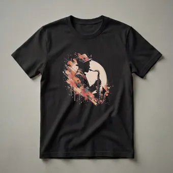 Jazz musicians and enthusiasts will appreciate the artistic flair of this graphic tee. The design features a silhouette of a saxophonist, complete with a fedora-style hat, captured mid-performance. Abstract brush strokes in warm tones of orange, red, and beige explode around the figure, accented by scattered dots and splatters, creating a dynamic and energetic visual. The saxophone itself is rendered with detail, showcasing its intricate keys and curves. The overall aesthetic evokes the improvisational spirit and vibrant sound of jazz music. This t-shirt is a thoughtful gift for any saxophonist, jazz band member, or music teacher who loves the expressive nature of brass and woodwind instruments. It's a great conversation starter at jam sessions, concerts, or casual gatherings. The saxophone, a member of the woodwind family, is known for its versatility and soulful tone, making this shirt a fitting tribute to its iconic status in music. This apparel is a staple for any musician's wardrobe.