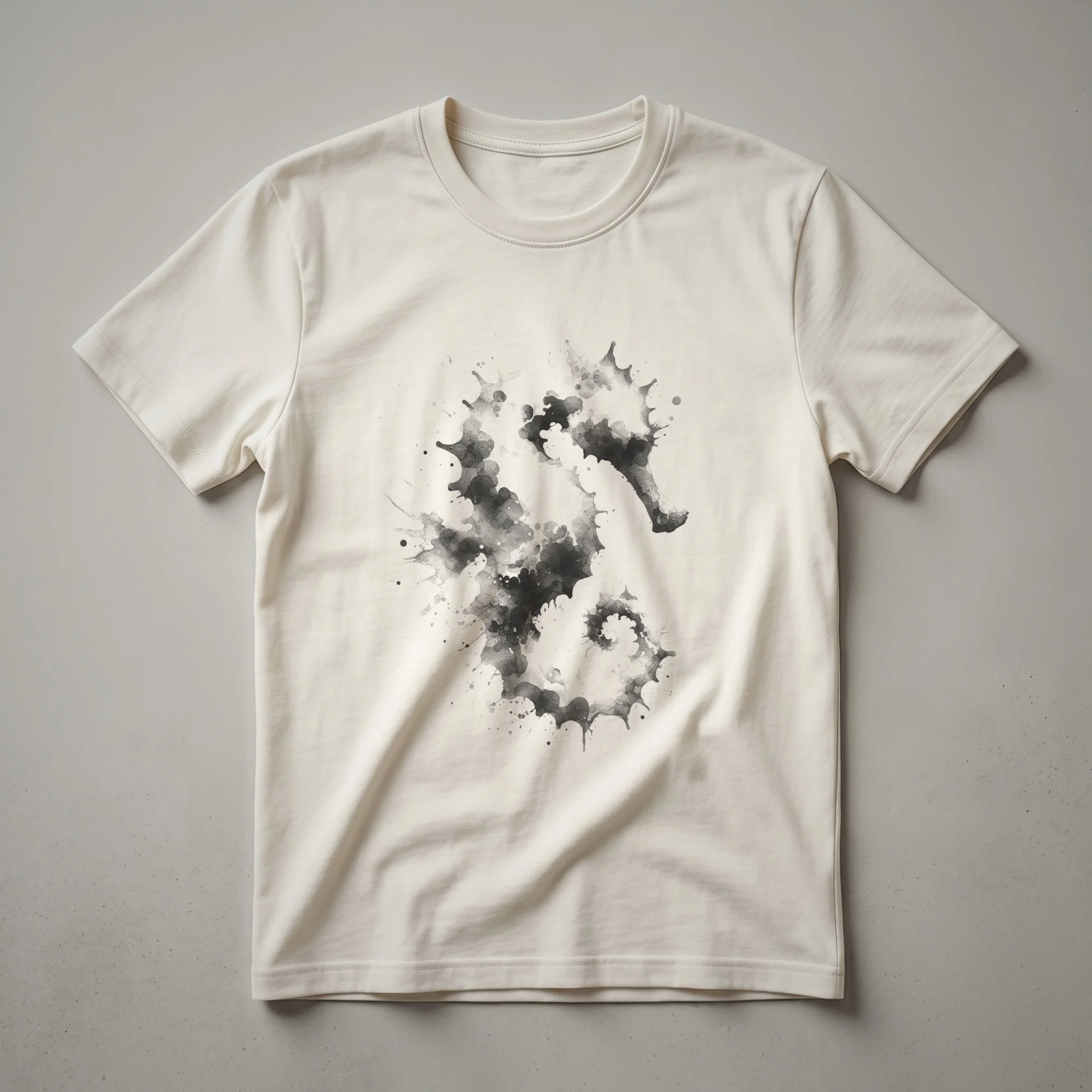 Marine life enthusiasts and lovers of unique art will appreciate this abstract seahorse graphic tee. The design features a seahorse rendered in a dark, watercolor-like style, with flowing lines and subtle textures that evoke the movement of the ocean. Seahorses, known for their distinctive appearance and graceful swimming, are fascinating creatures that inhabit shallow tropical and temperate waters around the world. They are often found in seagrass beds, coral reefs, and mangrove areas, where they can anchor themselves with their prehensile tails. This t-shirt captures the ethereal beauty of these marine animals, making it a standout piece for anyone drawn to the ocean's wonders. It's a thoughtful gift for divers, marine biologists, or anyone who finds inspiration in the underwater world. Wear this shirt to your next beach outing or casual gathering to spark conversations about marine conservation and the beauty of the sea. This tee is a staple for those who admire the intricate details of nature and wish to express their passion through their wardrobe. The abstract artistic interpretation offers a modern twist on classic marine imagery, appealing to a sophisticated aesthetic.