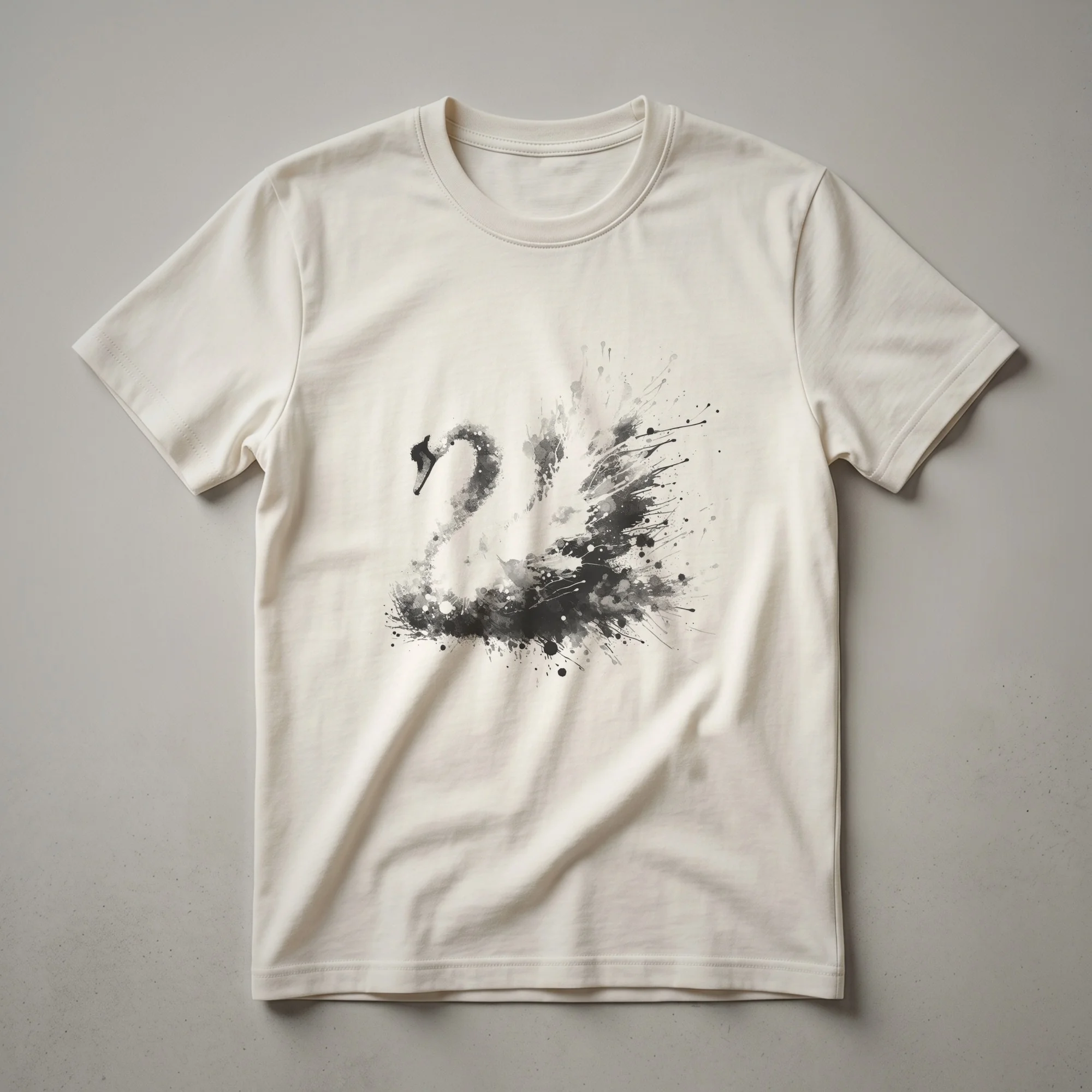 - Abstract swan ink splatter graphic t-shirt for bird enthusiasts.