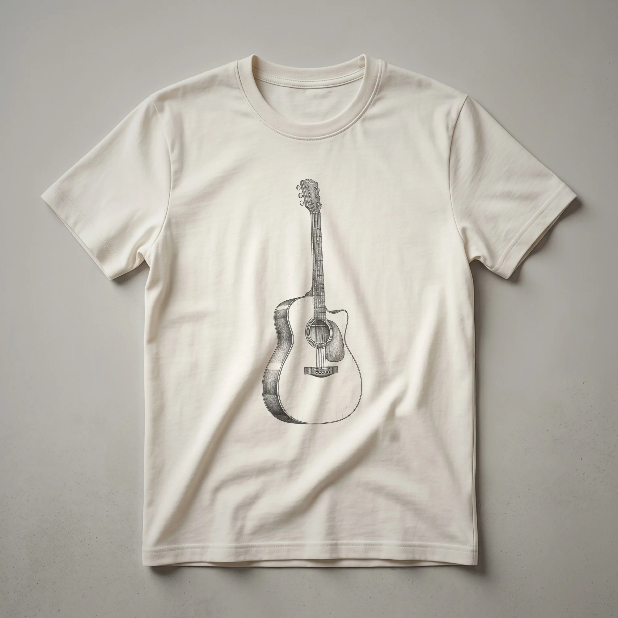 Musicians and music lovers who appreciate the artistry of stringed instruments will reach for this acoustic guitar sketch tee. The design features a detailed line drawing of an acoustic guitar, capturing its elegant curves and intricate details from the headstock with tuning pegs down to the bridge and strings. Acoustic guitars, known for their warm, resonant tone, have been a staple in folk, blues, country, and rock music for decades. This shirt is a subtle yet striking way to express your connection to the instrument. It's a thoughtful gift for the guitarist in your life, whether they play fingerstyle, strum chords, or compose melodies. Imagine wearing this t-shirt to a jam session, a music lesson, or simply while relaxing at home, strumming your favorite tunes. This graphic tee serves as a conversation starter for fellow musicians and admirers of musical instruments. It’s a versatile piece of apparel that celebrates the beauty and sound of the acoustic guitar, making it a go-to item for any music enthusiast's wardrobe.