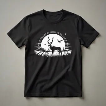 African savanna wildlife enthusiasts will appreciate this striking graphic tee featuring a serene nature scene. The artwork depicts a majestic antelope with impressive horns standing tall in the foreground, surrounded by lush grass and a lone acacia tree. Two smaller antelopes graze nearby, while birds soar across a large, stylized moon that dominates the night sky, complete with a crescent moon and stars. This design captures the essence of the African plains at dusk or dawn, a time when many antelope species are most active. Antelopes, such as the gazelle and impala, are known for their incredible speed and agility, often found in herds across the grasslands and savannas of Africa. This shirt is a thoughtful gift for anyone who admires these graceful creatures and the wild landscapes they inhabit. Wear this t-shirt on your next nature walk, hike, or casual outing to express your connection to the natural world. It's a staple piece for any wardrobe celebrating the beauty of wildlife.