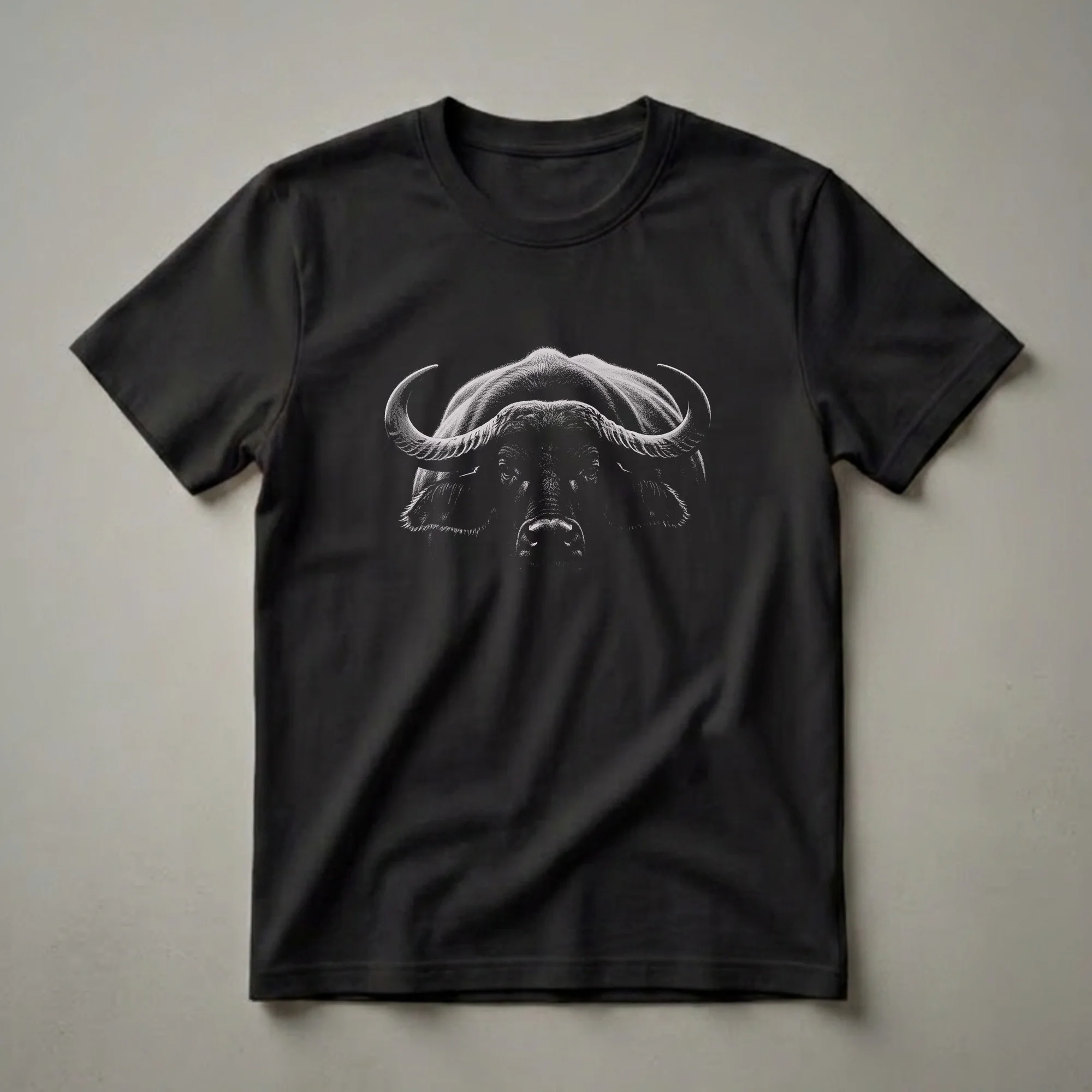 - Wildlife art tee with a high-contrast black-and-white Cape Buffalo head illustration filling the shirt