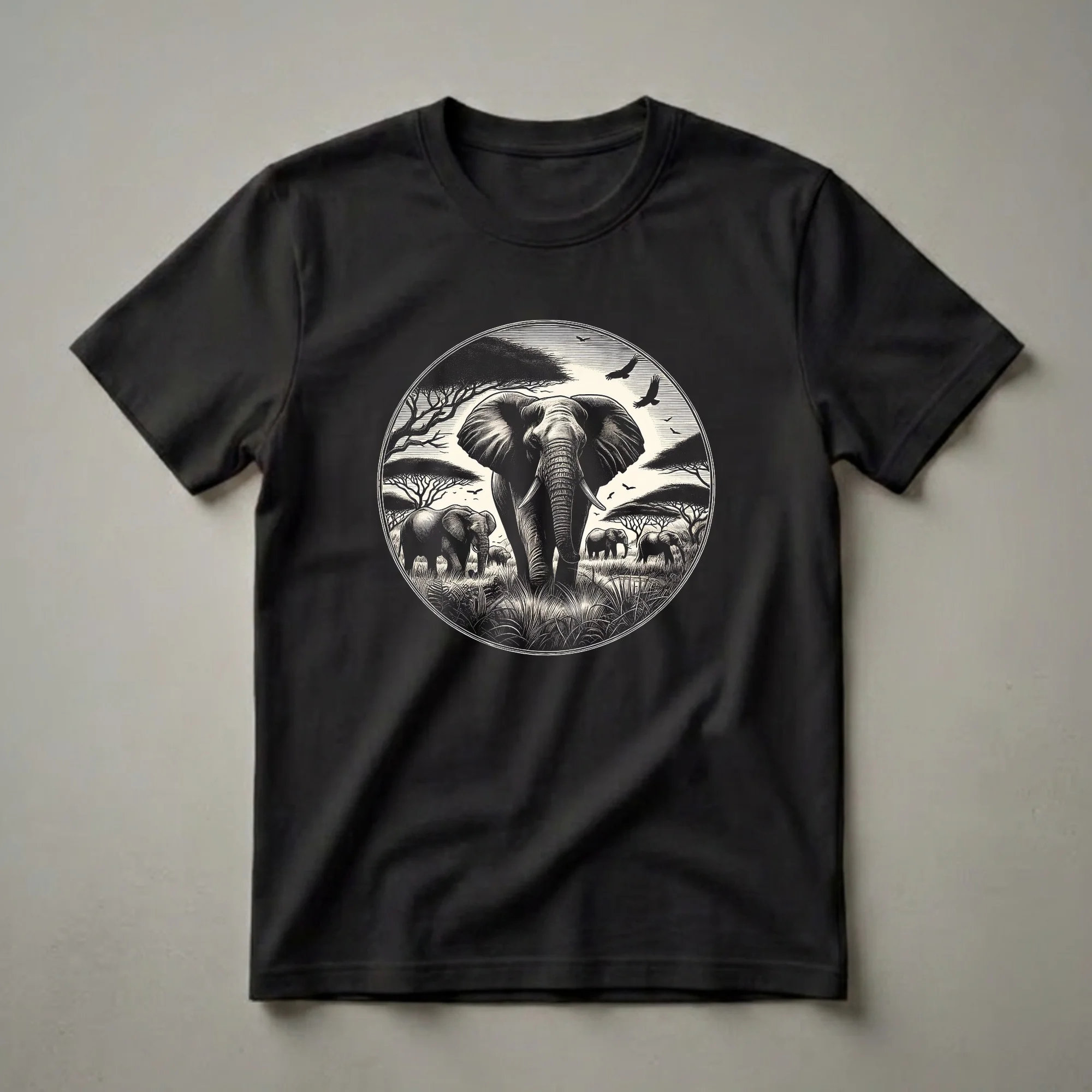 Young explorers who dream of the savanna will adore this graphic t-shirt featuring a detailed black and white illustration of elephants in their natural habitat. The artwork is enclosed within a circular frame, showcasing a majestic bull elephant in the foreground, with other elephants grazing peacefully in the background. Acacia trees, characteristic of the African landscape, dot the horizon, and birds soar in the sky, completing the immersive safari scene. African elephants, the largest land animals on Earth, are known for their complex social structures and intelligence, often found in herds led by matriarchs. This tee is a wonderful way for children to express their fascination with these incredible creatures. It makes a thoughtful gift for any child turning 7, 8, or 9 who is captivated by wildlife and dreams of embarking on an African adventure or working as a zoo keeper. This shirt is a go-to for casual wear, school days, or birthday parties, allowing kids to showcase their love for elephants and the wild.