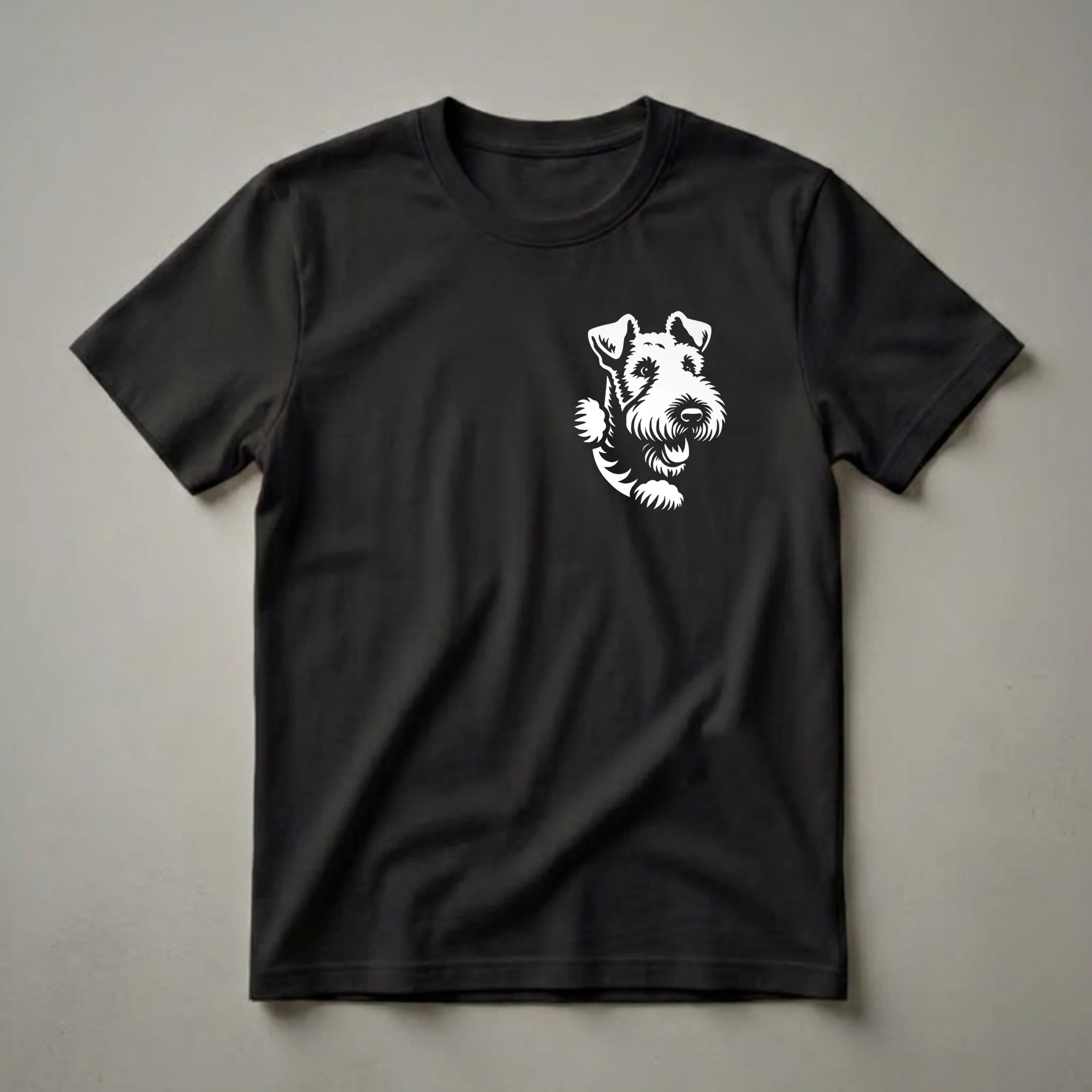 - Features a charming white graphic of a peeking Airedale Terrier.