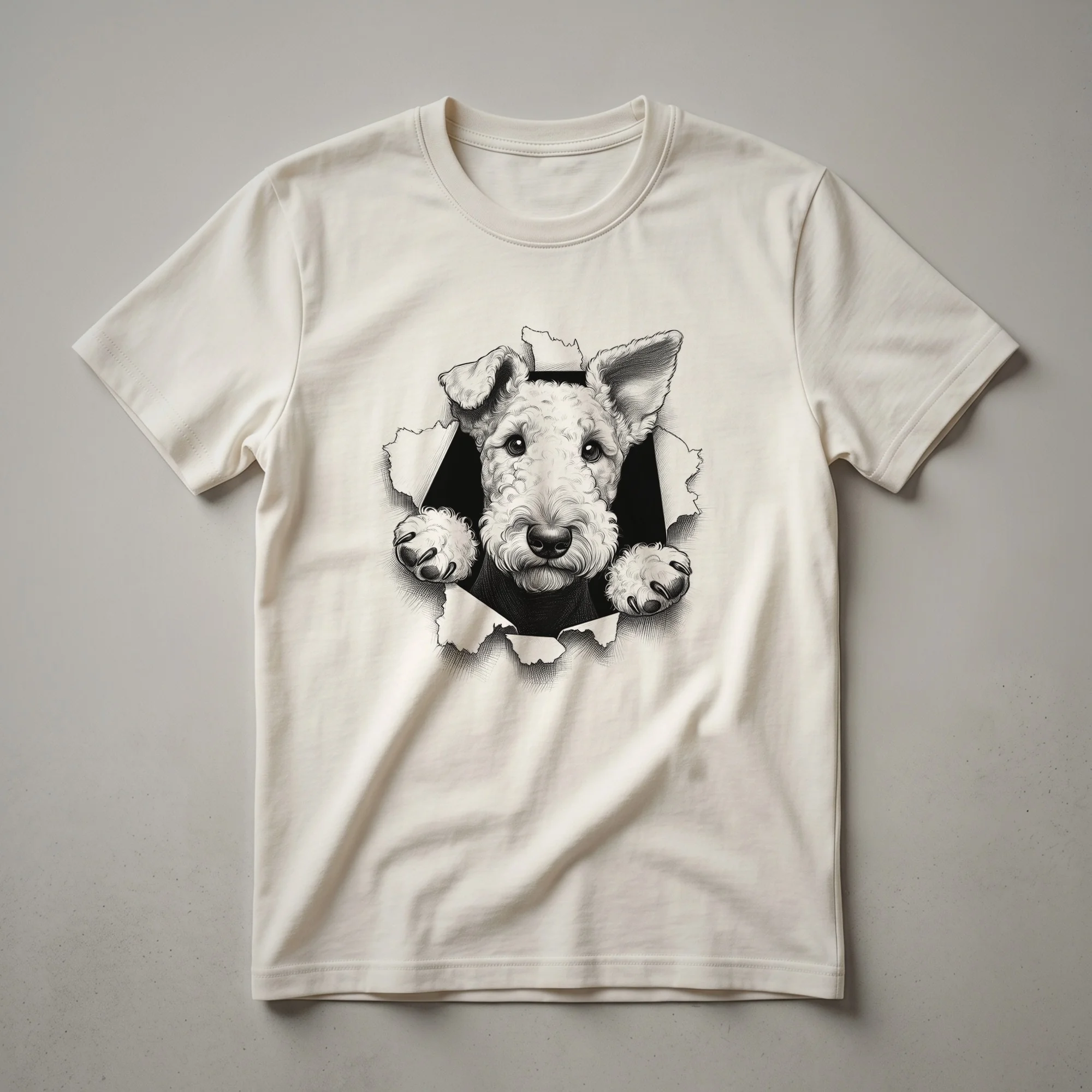 Airedale Terrier owners who appreciate a touch of whimsy will adore this graphic tee. The design features the distinctive head of an Airedale Terrier peeking playfully over a vibrant floral border. This eye-catching graphic is rendered in a charming, illustrative style, making it a standout piece for any dog enthusiast. The Airedale Terrier, known as the 'King of Terriers,' is the largest of the terrier breeds, originating from the Aire Valley in Yorkshire, England. They were originally bred for hunting otter, badger, and fox. This shirt is a wonderful way for any Airedale mom or dad to express their affection for their spirited companion. It makes a thoughtful gift for birthdays, holidays, or just because for the Airedale lover in your life. Wear this comfortable t-shirt to your next dog park visit, a casual outing with friends, or while relaxing at home with your furry friend. It’s a staple in the collection for anyone who cherishes their Airedale.