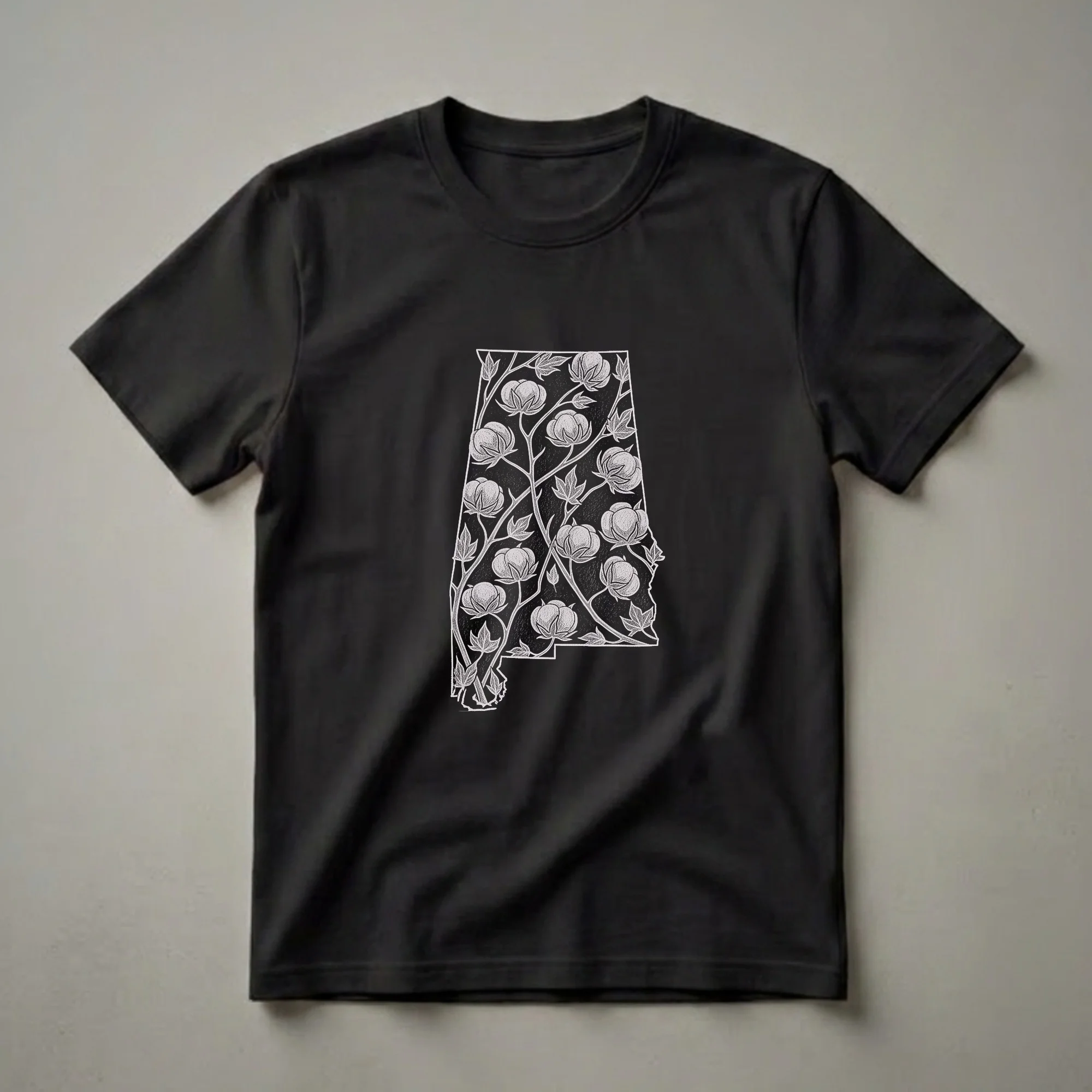 Alabama residents and fans of the Cotton State will appreciate this distinctive graphic tee. The design showcases the familiar outline of Alabama, intricately filled with a repeating pattern of cotton plants, complete with fluffy bolls and detailed leaves. This visual motif pays homage to Alabama's historical significance as a major cotton-producing state, a legacy that shaped its economy and culture for generations. The artwork is rendered in a classic, almost etched style, giving it a vintage appeal that resonates with those who cherish state identity and heritage. This shirt works well for casual outings, family gatherings, or as a conversation starter. It makes a thoughtful gift for anyone with ties to Alabama, whether they are lifelong residents, former inhabitants, or simply admirers of its rich history and natural beauty. Wear this t-shirt to express your connection to the Heart of Dixie and its enduring agricultural roots. This apparel is a true representation of the state's identity.