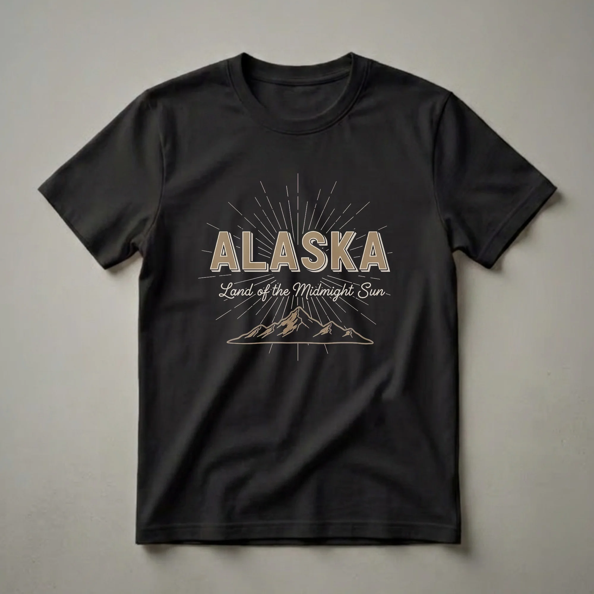This striking black t-shirt features a bold, vintage-inspired graphic that captures the essence of Alaska. Dominating the design is the word "ALASKA" in large, block letters with a subtle drop shadow, rendered in a warm, earthy tan. Beneath this, elegant script reads "Land of the Midnight Sun," a phrase that evokes the unique phenomenon of extended daylight experienced in the northern latitudes during summer. Radiating outward from behind the text are thin, line-art sunburst rays, creating a retro aesthetic. The focal point of the lower design is a stylized silhouette of a rugged mountain range, also in a complementary tan hue, representing the state's dramatic natural landscapes. Alaska, the largest state in the U.S. by area, is renowned for its vast wilderness, including towering peaks and its iconic midnight sun phenomenon. This shirt is a thoughtful gift for women or men who have visited or dream of visiting Alaska, or for anyone proud of their Alaskan heritage. It's a distinctive piece of apparel for those who appreciate nature and the call of the wild. Wear this tee on your next outdoor adventure or to showcase your state pride.
