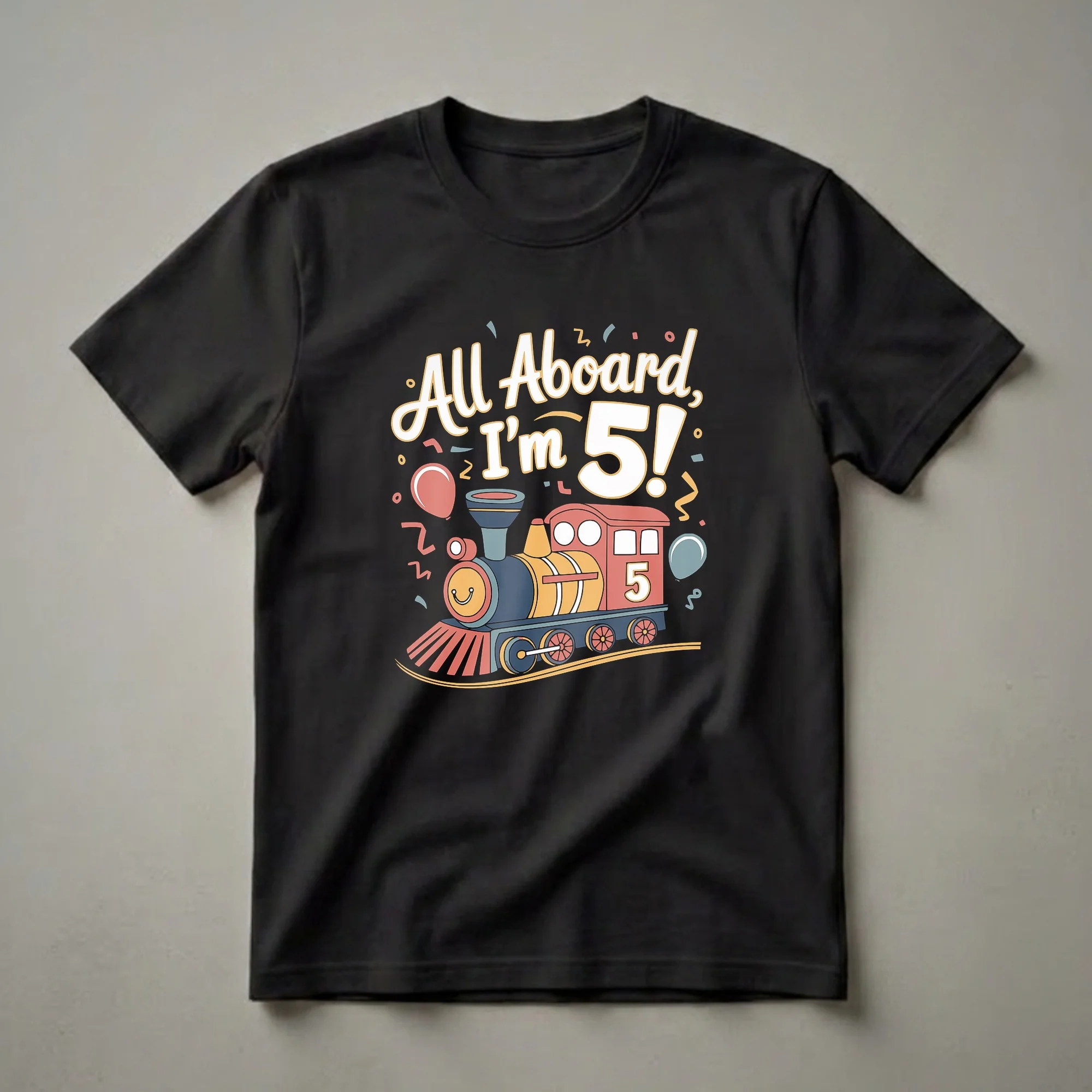 All aboard for a fantastic fifth birthday celebration! This eye-catching graphic tee features a vibrant, cartoon-style train chugging along, ready to mark a special milestone. The text "All Aboard, I'm 5!" is prominently displayed in playful, colorful lettering, making it clear this shirt is for the birthday boy or girl turning five. The train itself is a cheerful mix of red, yellow, and blue, complete with a smiling face on the front and the number '5' emblazoned on its side. Scattered confetti and balloons add to the festive atmosphere, creating a design that captures the excitement of turning five. This t-shirt is a wonderful way for any child who adores trains to showcase their big day. It's a thoughtful gift for a 5-year-old who is fascinated by locomotives and the magic of rail travel. Imagine their delight wearing this special shirt to their birthday party, a family gathering, or even just for a fun day out. This shirt is a staple for any young train enthusiast's birthday wardrobe, ensuring they feel celebrated and special on their big day.