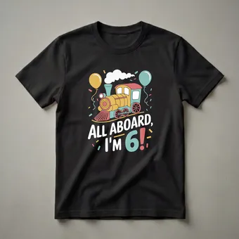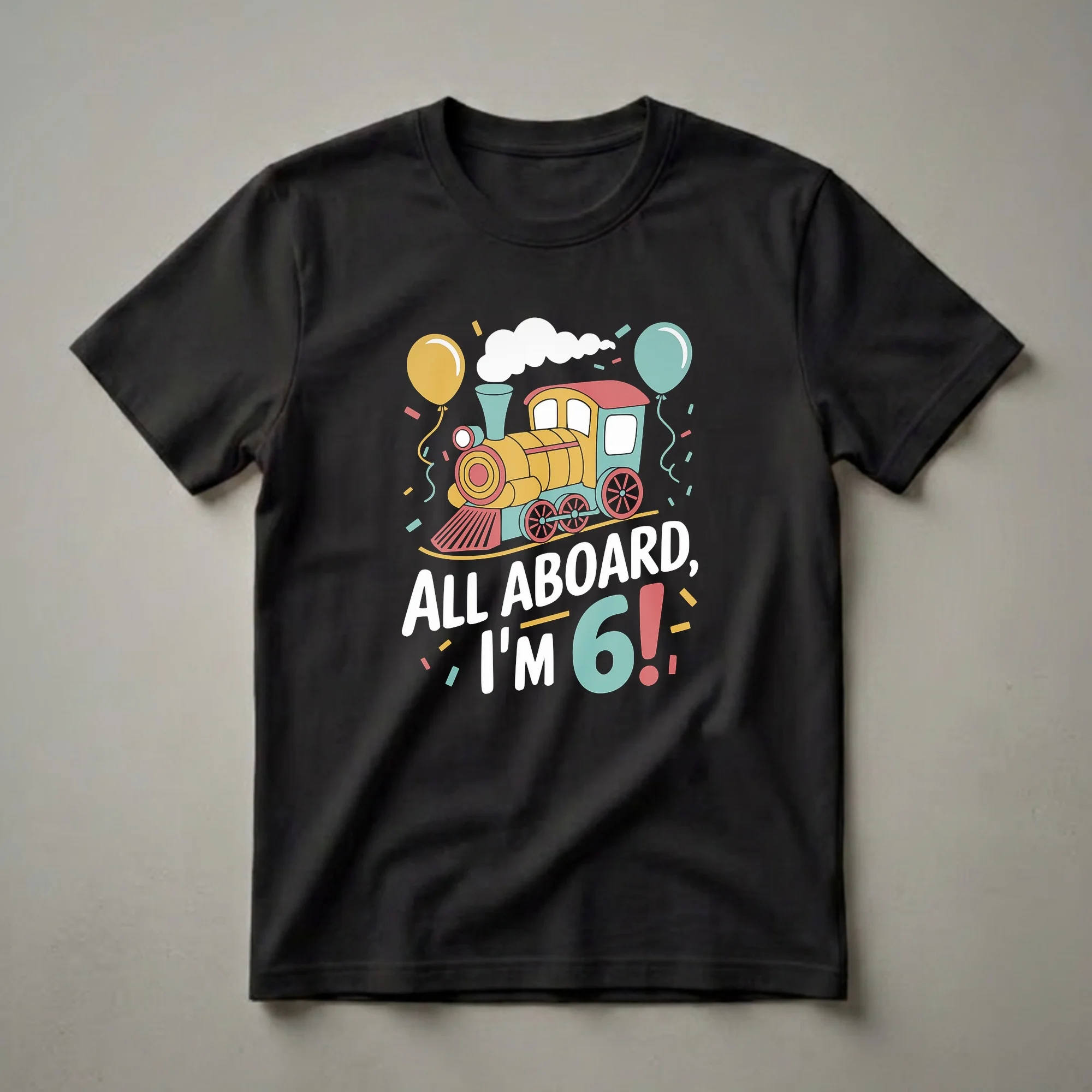 Six-year-olds embarking on their sixth year will love this vibrant train-themed birthday tee. The graphic features a cheerful, cartoon-style steam engine puffing white clouds, adorned with festive yellow and teal balloons and scattered confetti. Bold white lettering proclaims 'ALL ABOARD, I'M 6!', making it clear this shirt is for the birthday star. This design captures the excitement of turning six, a milestone year where children often develop a keen interest in vehicles and imaginative play. Trains, with their powerful engines and rhythmic journeys, have captivated young minds for generations, symbolizing adventure and discovery. This t-shirt is a thoughtful gift for any child who dreams of being a conductor or simply adores locomotives. It's a fantastic choice for a birthday party, a special birthday brunch, or just for everyday wear to show off their big six. The playful design ensures it will be a go-to tee for any celebration marking this special age. Parents and gift-givers will appreciate how this shirt celebrates a child's growth and interests, creating a fun and memorable birthday outfit.