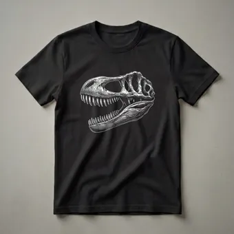 Paleontology enthusiasts and dinosaur fans will appreciate this detailed graphic t-shirt featuring an Allosaurus skull. The striking black and white linocut style illustration captures the formidable nature of this large theropod dinosaur, which roamed the Earth during the Late Jurassic period. Allosaurus, meaning 'different lizard,' was a formidable predator known for its powerful jaws and sharp teeth, measuring up to 30 feet in length. This shirt is a fantastic way for men and women to express their fascination with ancient life. It makes a thoughtful gift for anyone who enjoys natural history, fossils, or the Mesozoic era. Wear this unique tee to a museum visit, a paleontology lecture, or simply as a conversation starter on casual outings. This shirt is a staple for any dinosaur aficionado's wardrobe, offering a blend of scientific accuracy and artistic flair.