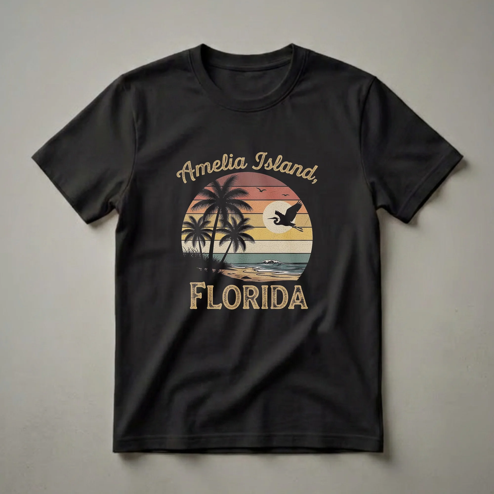 Travelers and residents who cherish the coastal charm of Amelia Island will reach for this retro-inspired graphic tee. The design showcases a classic beach sunset scene, complete with silhouetted palm trees and a lone bird in flight against a vibrant, striped sky. The ocean waves gently roll onto the sandy shore, evoking the serene atmosphere of Florida's Atlantic coast. Amelia Island, located in Northeast Florida, is known for its pristine beaches, historic charm, and abundant wildlife, making it a popular destination for those seeking relaxation and natural beauty. This t-shirt serves as a wearable memento of sunny days and ocean breezes. It makes a thoughtful gift for anyone who has fond memories of visiting or living on this beautiful barrier island. Wear this shirt to your next beach outing, casual gathering, or while reminiscing about your Florida adventures. The vintage aesthetic appeals to those who appreciate timeless travel designs and island vibes.