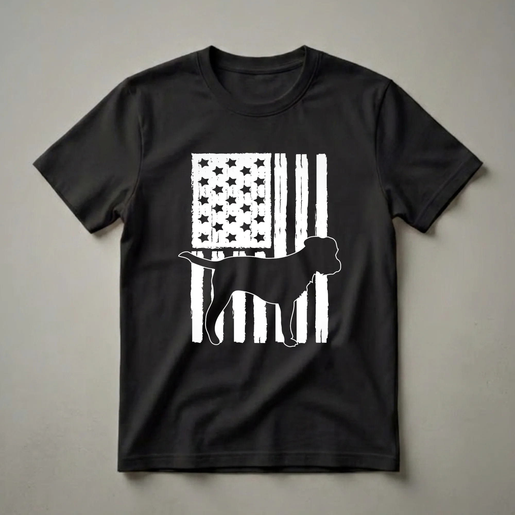 Border Terrier owners who want to showcase their national pride will reach for this striking graphic tee. The design features a bold, black silhouette of a Border Terrier standing proudly in front of a distressed American flag. The flag's white stars are scattered across a field of vertical white stripes, all rendered with a textured, brushstroke effect that gives it a vintage feel. The Border Terrier, known for its spirited yet affectionate nature, is depicted with its tail held high, embodying a sense of loyalty and energy. This shirt is a thoughtful gift for any Border Terrier mom or dad, celebrating the special bond between these tenacious terriers and their American families. It's a great way to express your love for your canine companion and your country, whether you're heading to a Fourth of July barbecue, a dog park outing, or just enjoying a casual day out. This t-shirt serves as a conversation starter for fellow dog enthusiasts and patriots alike. Wear it to show off your unique style and your devotion to your four-legged friend and the USA.