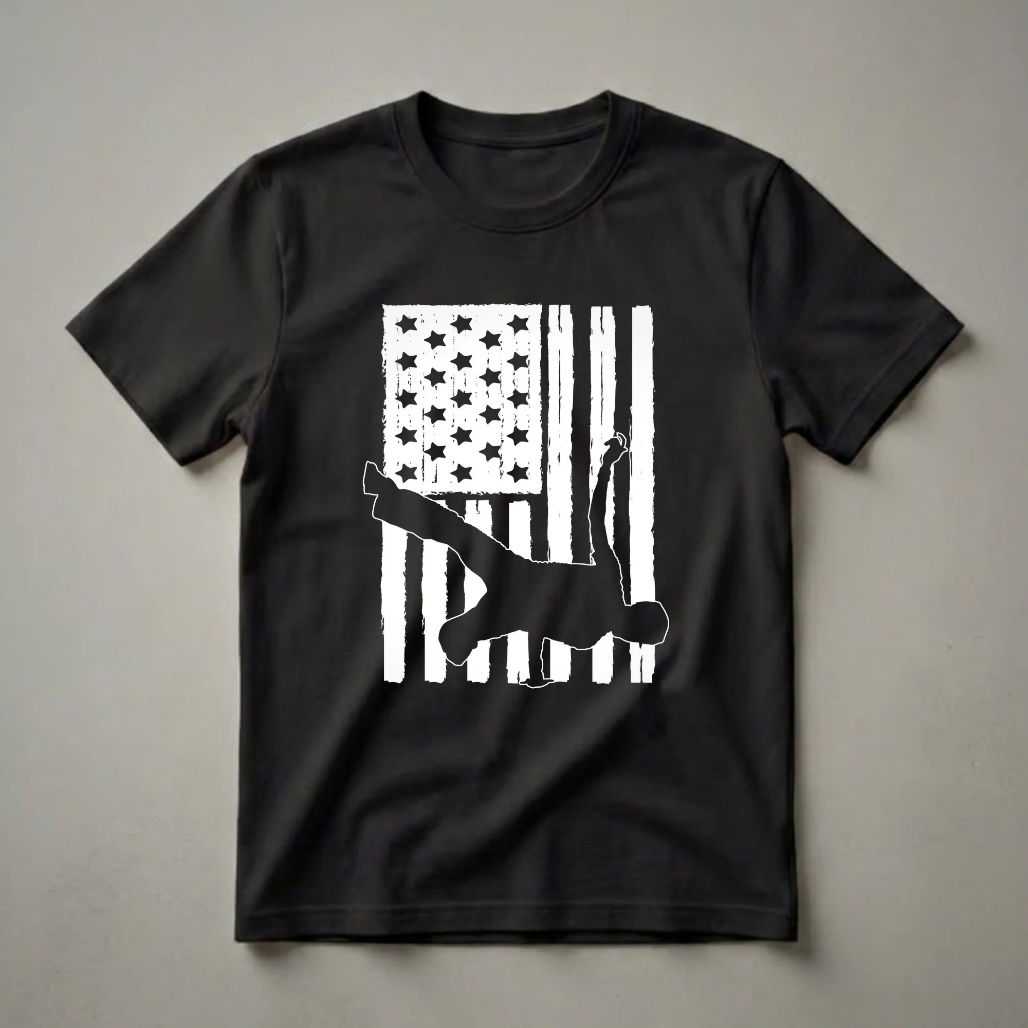 - Features a distressed American flag with a breakdancer silhouette.