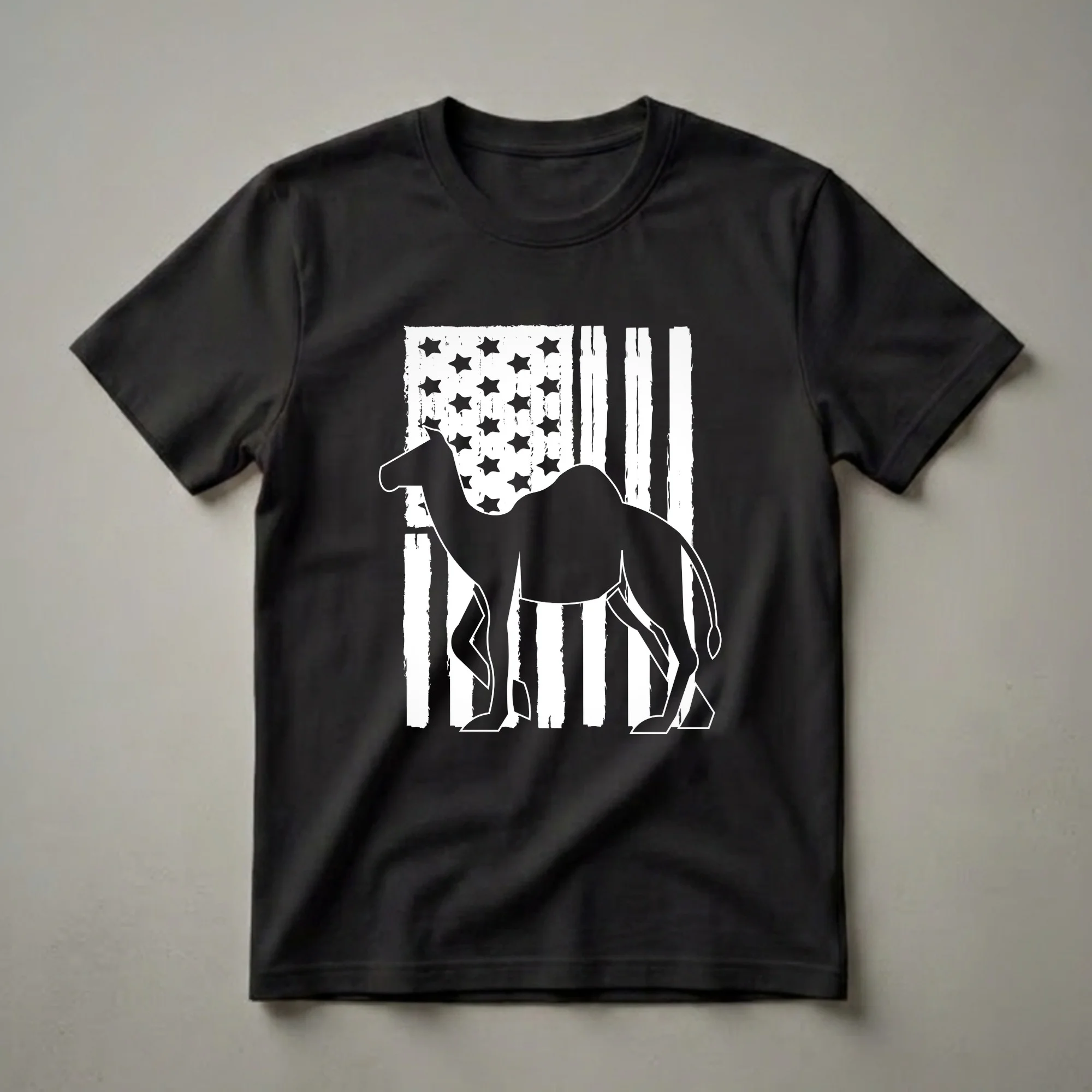 This striking graphic tee features a bold black silhouette of a camel positioned in front of a distressed American flag. The flag design includes vertical stripes and scattered stars, rendered in white with a textured, worn appearance that adds a vintage feel. The camel, a symbol of resilience and endurance, is depicted in profile, walking forward with its distinctive hump and long legs clearly defined. This shirt is a unique way for camel enthusiasts to express their love for these fascinating desert creatures while also showcasing their patriotic pride. Camels, known for their ability to survive in harsh desert environments, have been vital for transportation and survival in arid regions for thousands of years. This apparel makes a thoughtful gift for any camel mom or dad, or for someone who appreciates unique animal designs combined with national symbols. It's a conversation starter, a go-to for casual wear during patriotic holidays like the Fourth of July, Memorial Day, or any day you want to celebrate your love for America and its diverse wildlife. Wear this tee to parades, barbecues, or simply as a statement piece.