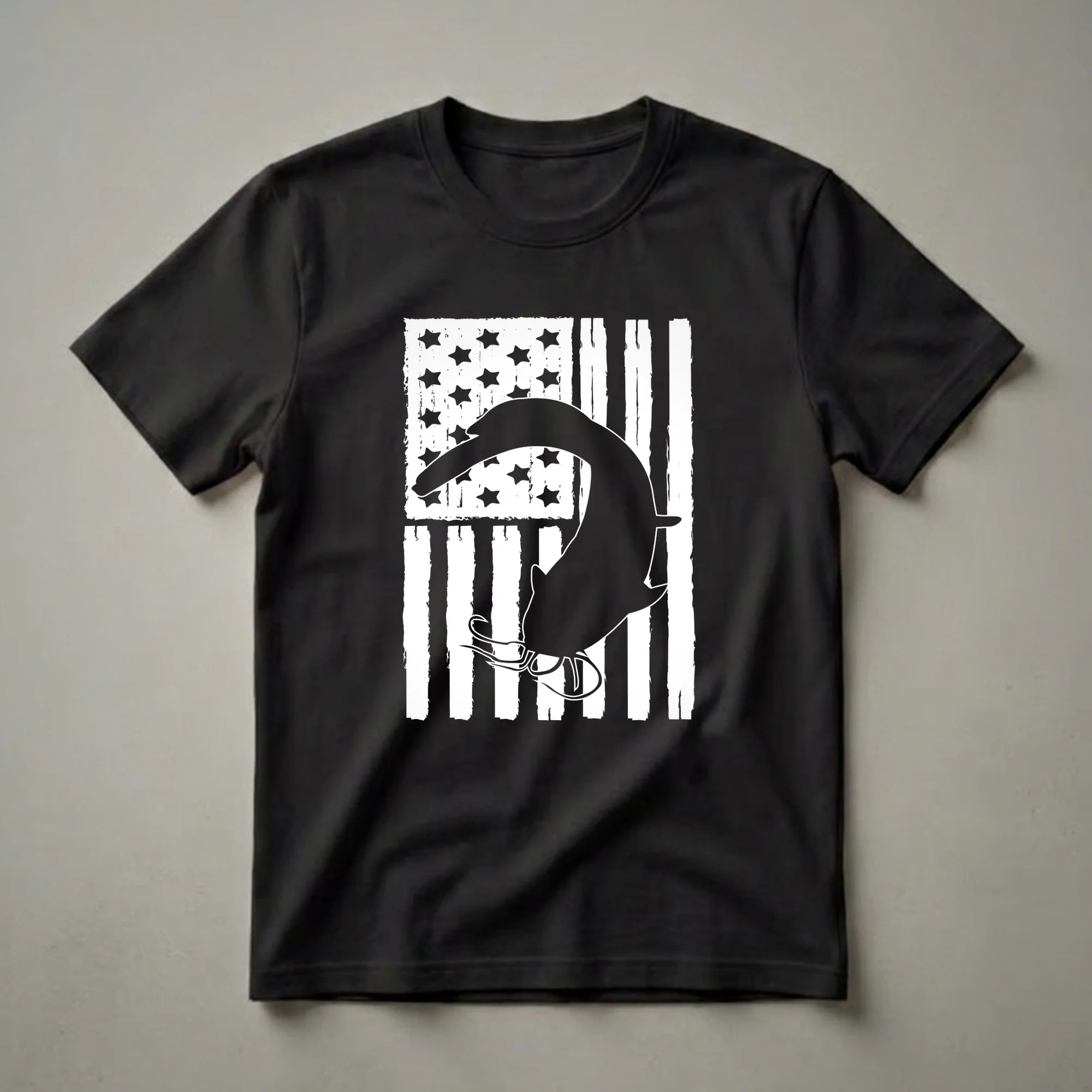 Catfish anglers who appreciate their patriotic spirit will reach for this unique graphic tee. The design features a bold black silhouette of a catfish, complete with its distinctive barbels, artfully overlaid on a distressed American flag. This t-shirt celebrates the thrill of reeling in a catch while showcasing national pride. Catfish, known for their resilience and presence in freshwater environments across North America, are a popular target for sport fishermen. This shirt is a thoughtful gift for the dad who spends his weekends by the lake or river, or for any fisherman who enjoys the challenge of catching these bottom-dwelling predators. Wear this tee on your next fishing trip, to a casual outdoor gathering, or while watching the game. It's a comfortable and stylish way for any fishing enthusiast to express their passion. The distressed flag adds a vintage, rugged appeal that resonates with the outdoor lifestyle. This shirt is a staple for any angler's wardrobe, offering a blend of style and personal expression.