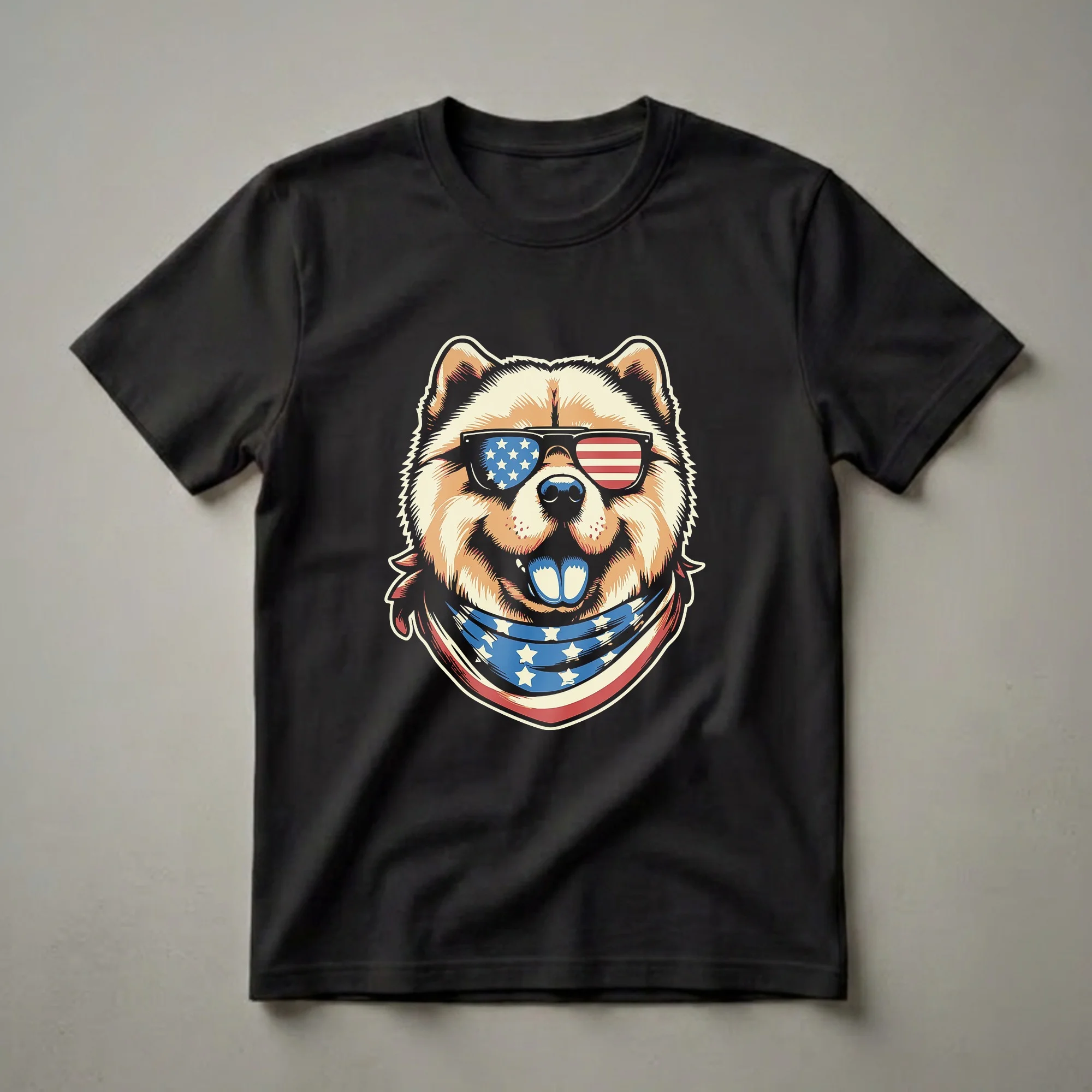 Chow Chow moms and dads who want to show both their breed love and their patriotism will reach for this colorful graphic tee. The design features a vibrant illustration of a Chow Chow's face with golden-tan fluffy fur, wearing bold black-framed sunglasses with American flag stars-and-stripes across both lenses in red, white, and blue. Around the dog's neck, a bandana in the same stars-and-stripes American flag pattern completes the patriotic look, tying the sunglasses and the accessory together into a coordinated statement. The Chow Chow is one of the oldest dog breeds in existence, with origins in ancient China dating back several thousand years. The breed was historically used as a working dog for hunting, herding, and guarding, and is known today for its lion-like mane of dense fur, distinctive blue-black tongue, and fiercely loyal but independent temperament. Their noble, dignified bearing makes them a natural fit for a regal patriotic design. This shirt makes a thoughtful gift for any Chow Chow owner who celebrates national holidays with their dog, attends patriotic events, or simply wants a breed-specific tee that doubles as a patriotic piece. Wear it to a Fourth of July party, a dog show, a Memorial Day cookout, or any casual day when the occasion calls for a bit of American dog pride. The full-color design stands out on the black shirt background.