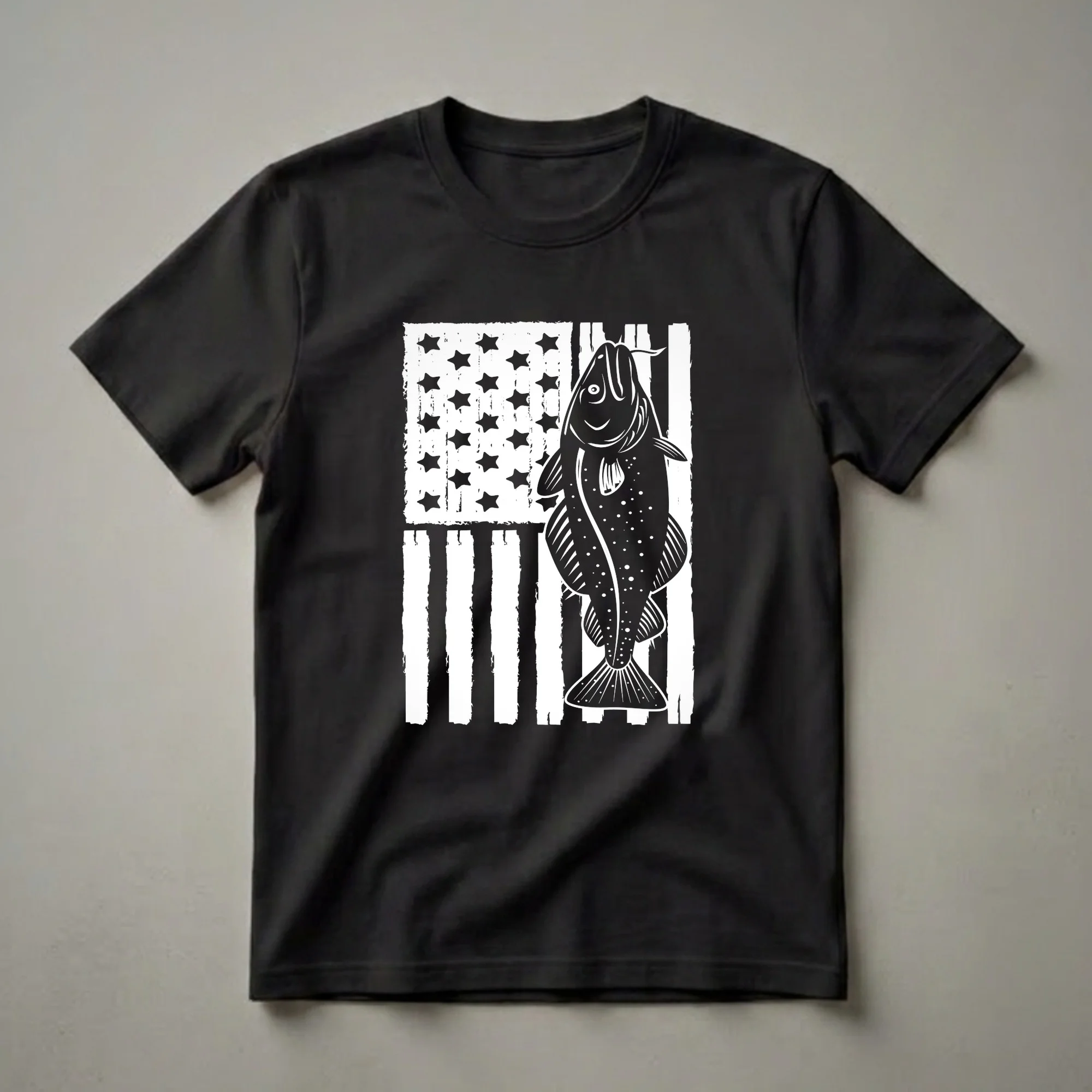 Anglers who appreciate the thrill of the catch will reach for this unique t-shirt featuring a distressed American flag design. Superimposed over the iconic stars and stripes is a bold silhouette of a cod fish, a popular species known for its flaky white flesh and its importance in commercial and recreational fishing. Cod are found in cold, deep waters of the North Atlantic and North Pacific oceans, often inhabiting rocky bottoms. This graphic tee is a thoughtful gift for the fisherman in your life who takes pride in their country and their passion for the sport. Whether you're heading out for a day on the boat or just want to showcase your love for the outdoors, this shirt is a great addition to any fishing enthusiast's wardrobe. It's a conversation starter for any fishing trip or casual outing, celebrating both patriotism and the pursuit of the perfect catch. This shirt works well for anyone who enjoys deep-sea fishing or simply admires the resilience and appeal of the cod.