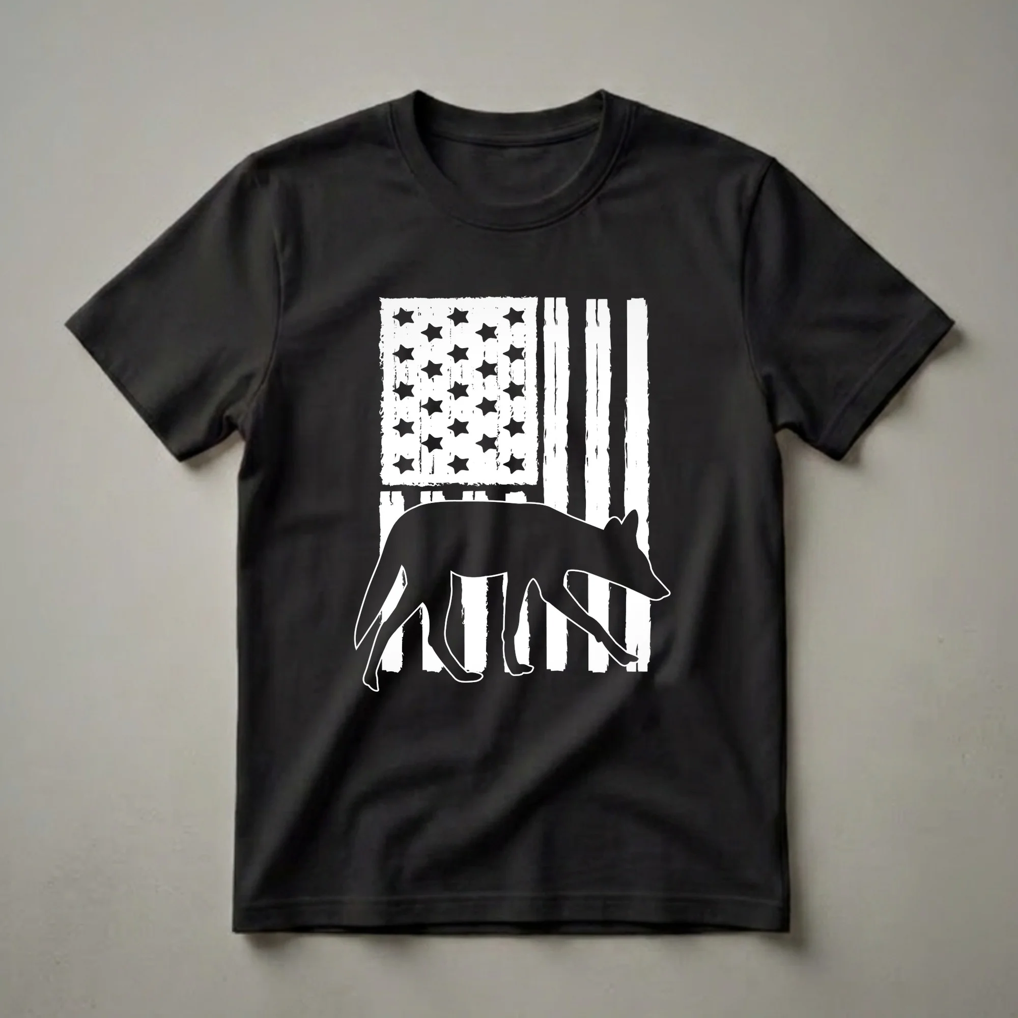 - This American flag coyote tee embodies the spirit of the wild.