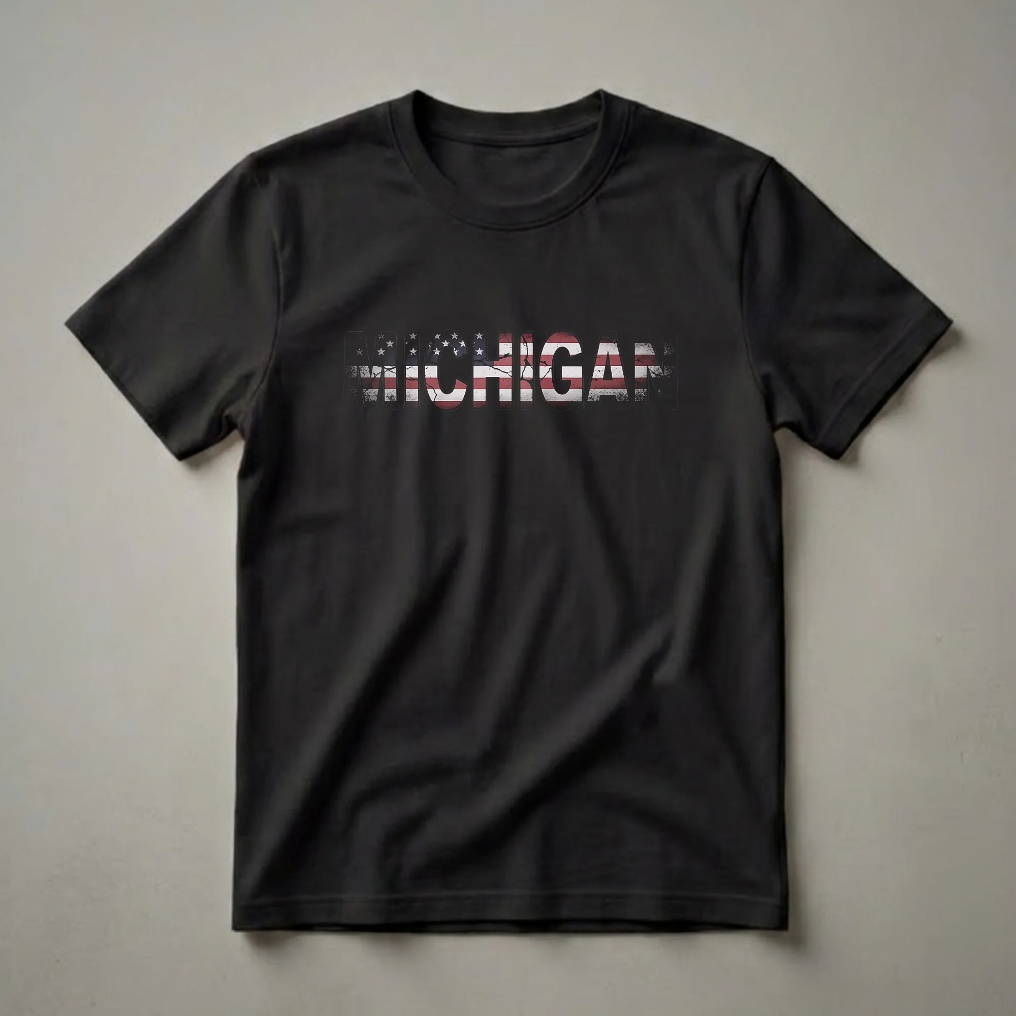 - Features a distressed American flag design within the word 'MICHIGAN'.