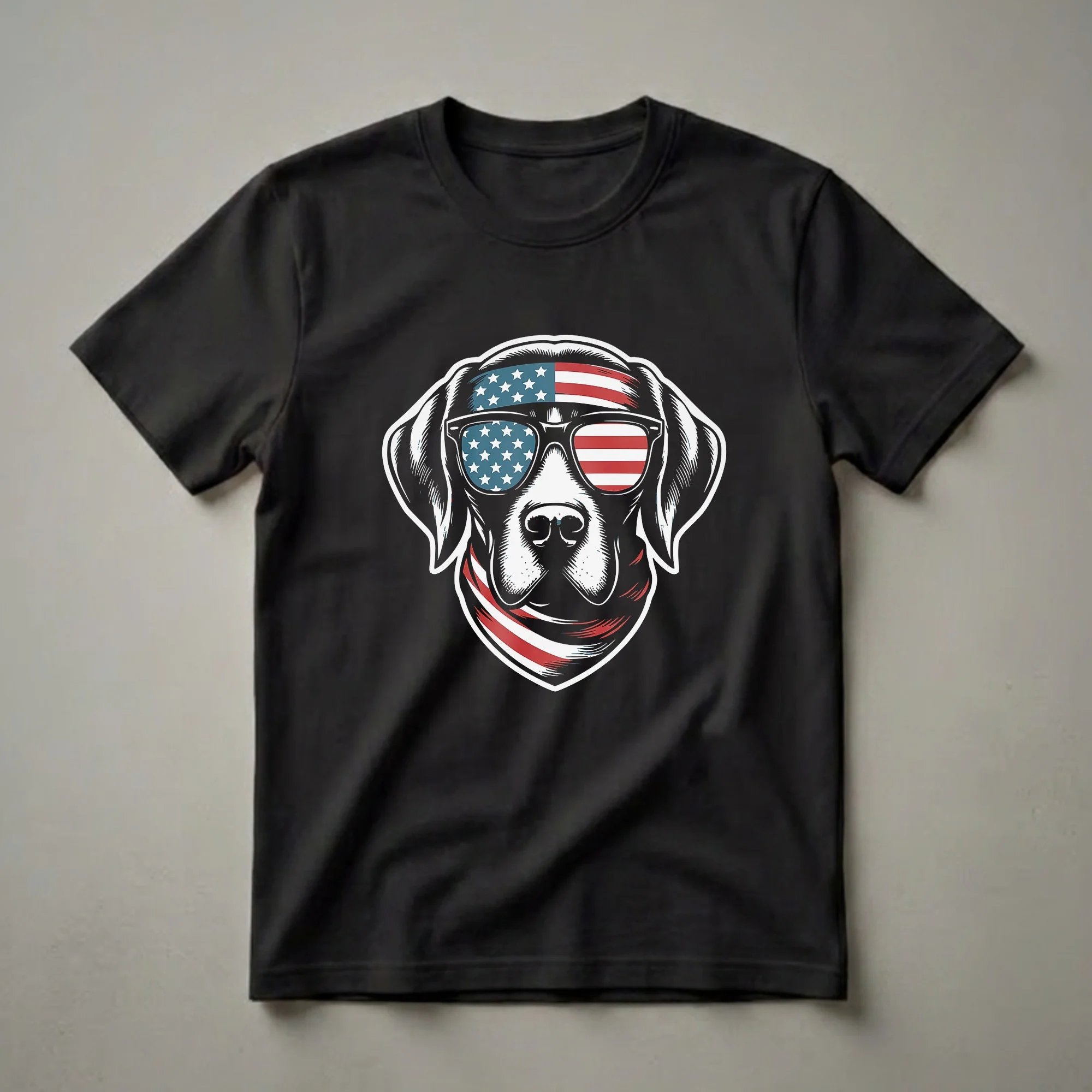 - Features a cool dog wearing American flag sunglasses and bandana.