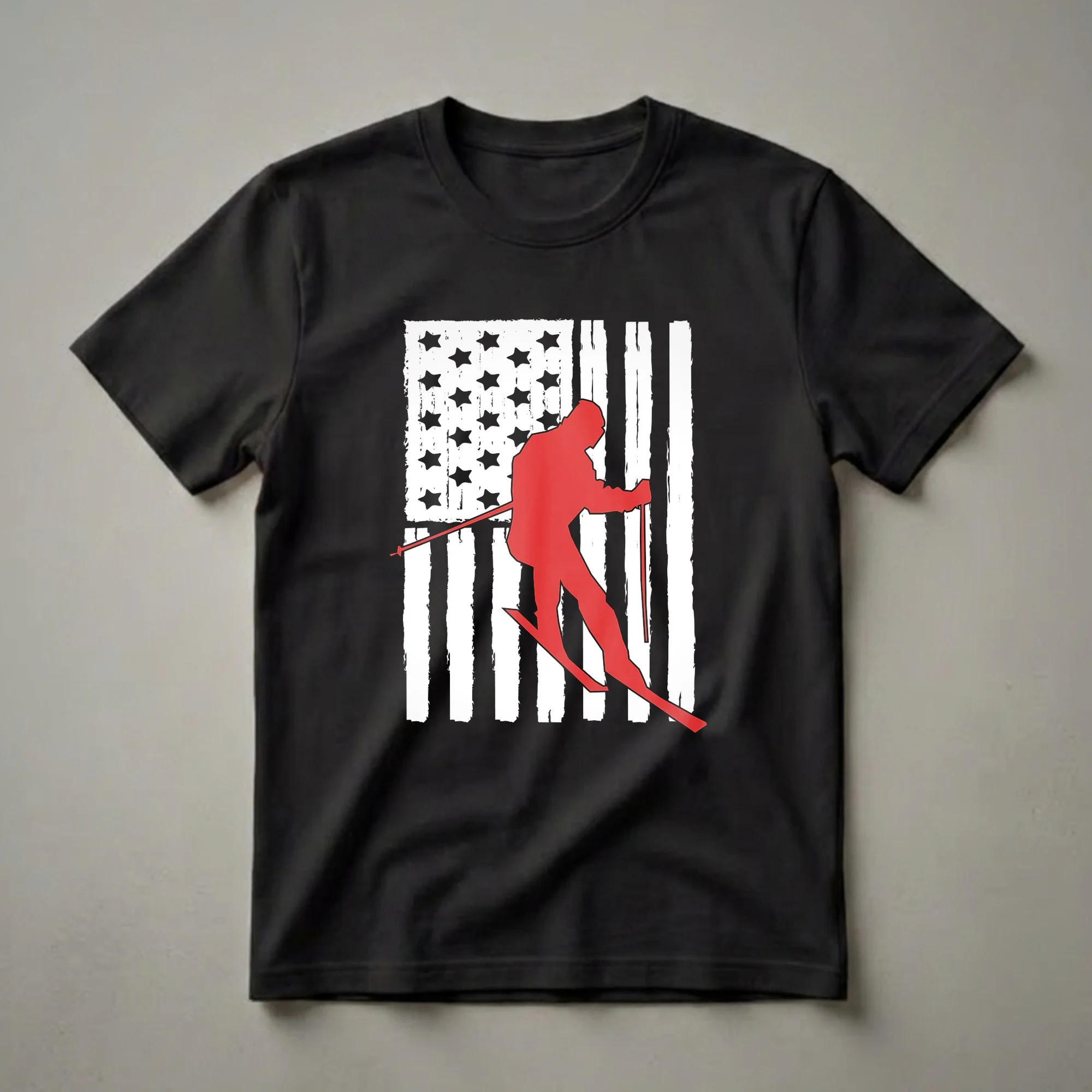Skiers who embrace the thrill of the slopes will reach for this unique t-shirt. The design features a distressed American flag as the backdrop, with a bold red silhouette of a downhill skier in action. This graphic tee captures the spirit of American winter sports enthusiasts. Downhill skiing, also known as alpine skiing, involves descending snow-covered slopes on skis with fixed-heel bindings. It's a popular sport enjoyed by millions worldwide, especially in mountainous regions across the United States. This shirt is a thoughtful gift for the skier in your life, whether they are a seasoned competitor or a weekend warrior hitting the bunny slopes. Wear it to the lodge after a day on the mountain or to casual gatherings to showcase your passion for skiing and country. This apparel is a staple for any winter sports fan's wardrobe.