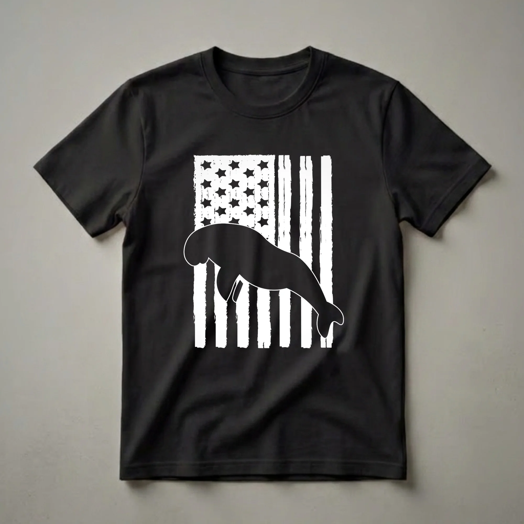 Animal lovers who appreciate unique marine life will reach for this striking t-shirt. The design features a distressed American flag motif, complete with bold stars and textured stripes, evoking a sense of patriotic pride. Overlaying this iconic backdrop is the gentle silhouette of a dugong, a fascinating marine mammal known for its peaceful nature and herbivorous diet. Dugongs, often called 'sea cows,' are found in warm coastal waters of the Indo-Pacific and are a symbol of marine conservation efforts. This graphic tee is a thoughtful gift for anyone who cherishes both their country and the wonders of the ocean. Wear this shirt to casual gatherings, beach outings, or any occasion where you want to showcase your dual passions for patriotism and the natural world. It's a conversation starter for those who admire the sea and the stars and stripes. This apparel is a wonderful way to express your unique interests.