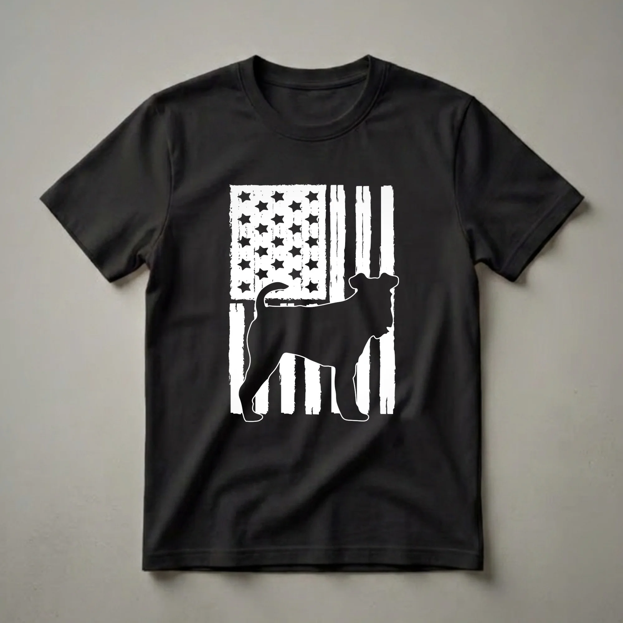 - Features a striking silhouette of a Fox Terrier against a distressed American flag.