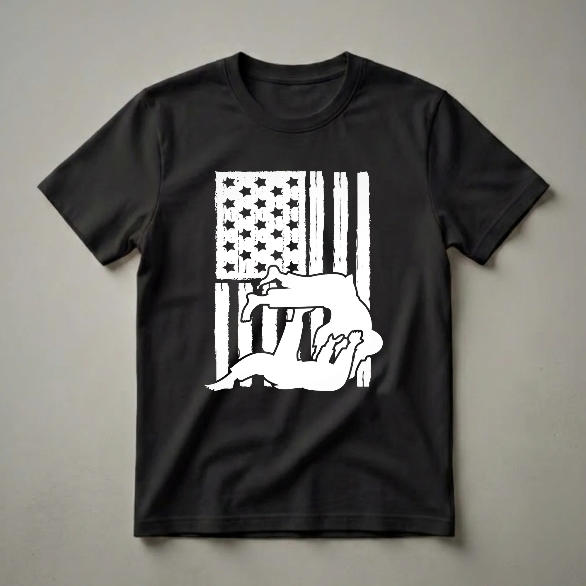 Martial arts practitioners who train in Jiu Jitsu can now showcase their dedication and patriotism with this unique graphic tee. The design features a distressed American flag as the backdrop, with two white silhouetted figures locked in a grappling hold, representing the dynamic nature of Jiu Jitsu. This art style highlights the intensity and skill involved in the sport, making it instantly recognizable to those familiar with ground fighting techniques. Jiu Jitsu, originating from Japan and refined in Brazil, emphasizes leverage and technique over brute strength, making it accessible to a wide range of individuals. This shirt is a thoughtful gift for a coach, training partner, or any family member who dedicates their time to the mats. Wear this t-shirt to your next training session, a martial arts tournament, or casual outings to spark conversations with fellow enthusiasts. It's a staple in the collection for anyone who respects the discipline and heritage of American Jiu Jitsu.