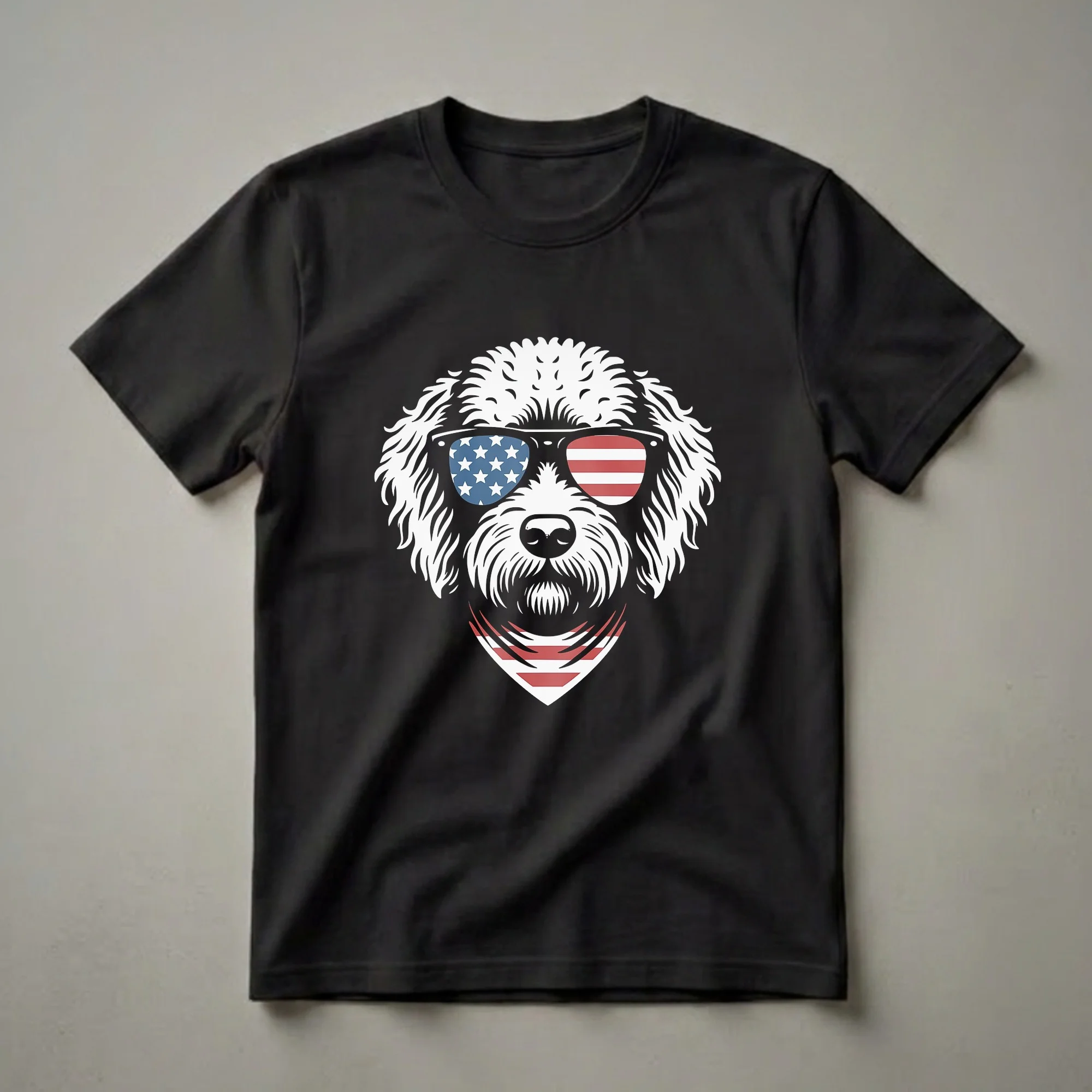 Labradoodle owners who love to show their patriotic pride will reach for this unique graphic tee. The design features a stylized white Labradoodle with a fluffy coat, sporting cool aviator sunglasses. The left lens of the sunglasses displays the iconic blue field with white stars, while the right lens features bold red and white stripes, mirroring the American flag. A matching bandana with red and white stripes completes the patriotic ensemble, draped around the dog's neck. Labradoodles are known for their intelligence and friendly nature, making them beloved companions. This shirt is a fantastic way for any Labradoodle mom or dad to express their love for their furry friend and their country. Wear this t-shirt to Fourth of July celebrations, Memorial Day parades, or any casual outing to showcase your American spirit and canine affection. It makes a thoughtful gift for dog lovers who appreciate unique and stylish apparel.