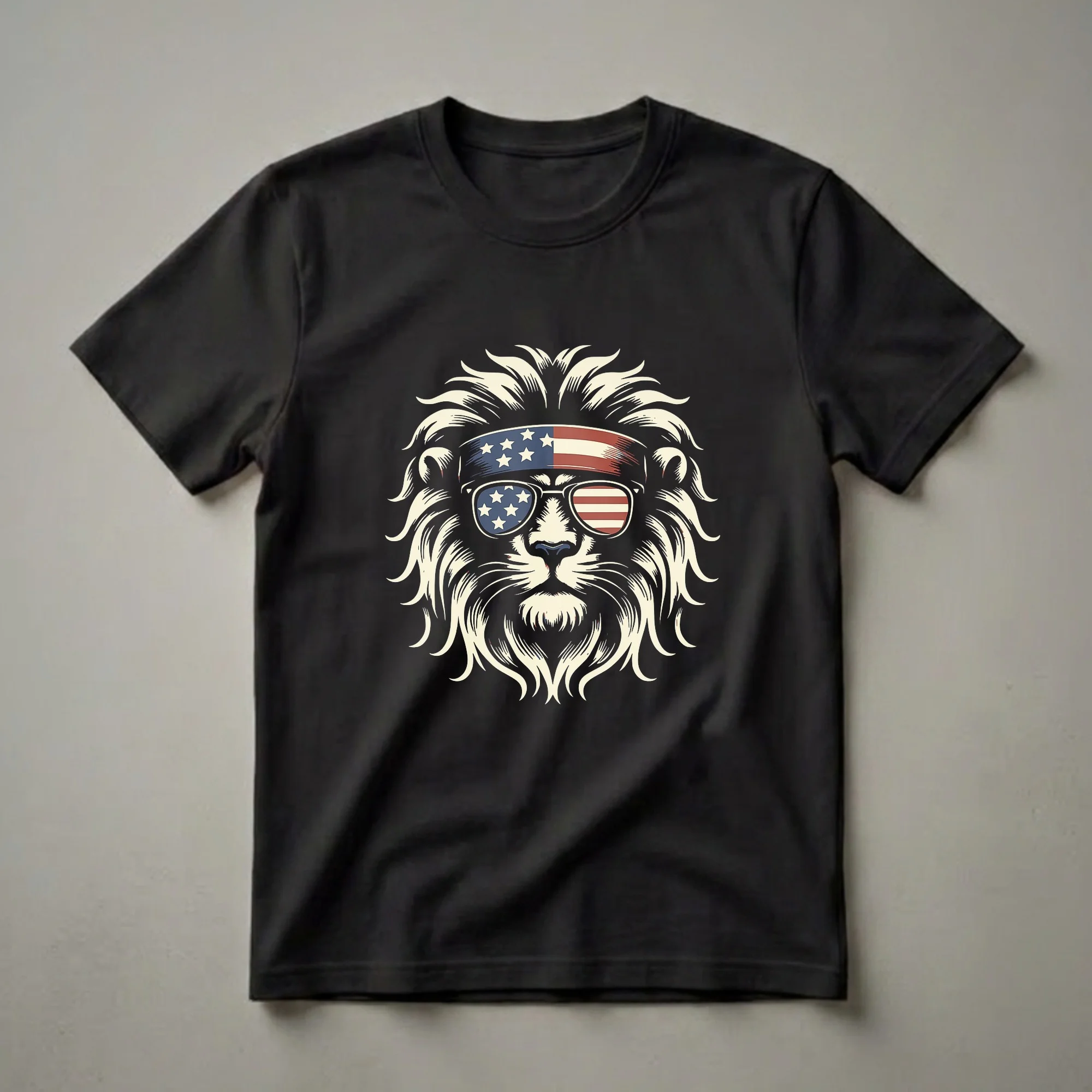 Patriotic men who want to showcase their American pride will reach for this eye-catching graphic tee. The design features a majestic lion's head, rendered in a bold, graphic art style. This regal creature sports a bandana across its forehead and cool sunglasses, both adorned with the iconic stars and stripes of the American flag. The lion's mane fans out dramatically, creating a powerful silhouette against the black background. The lion, often symbolizing strength and courage, is a fitting emblem for national pride. This shirt works well for individuals who appreciate bold imagery and a touch of Americana. It makes a thoughtful gift for veterans, active military personnel, or any man who loves the USA. Wear this t-shirt to Fourth of July celebrations, Memorial Day events, or any occasion where you want to display your patriotism with a unique flair. This comfortable tee is a staple for any wardrobe celebrating American heritage.