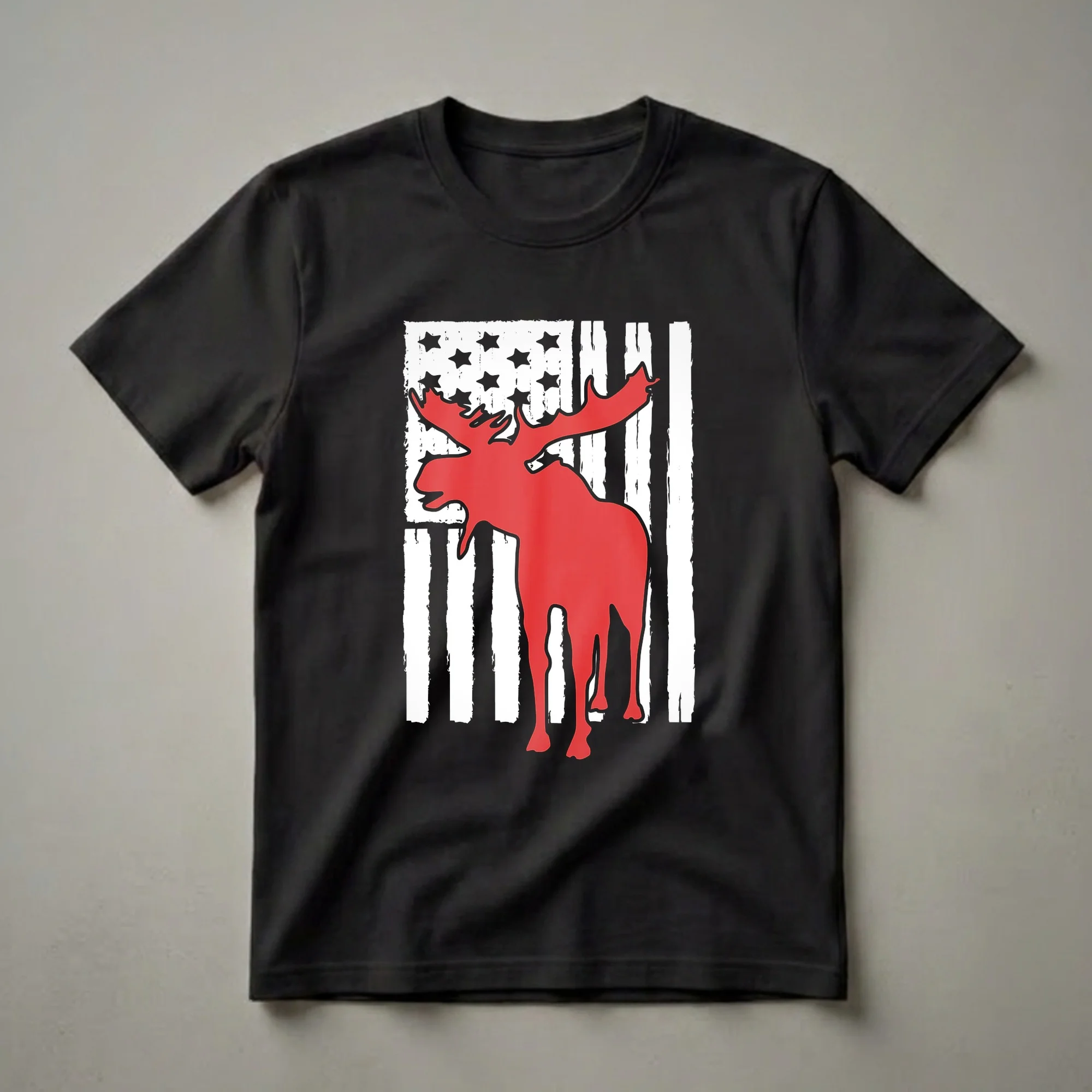 - Features a distressed American flag with a red moose silhouette.