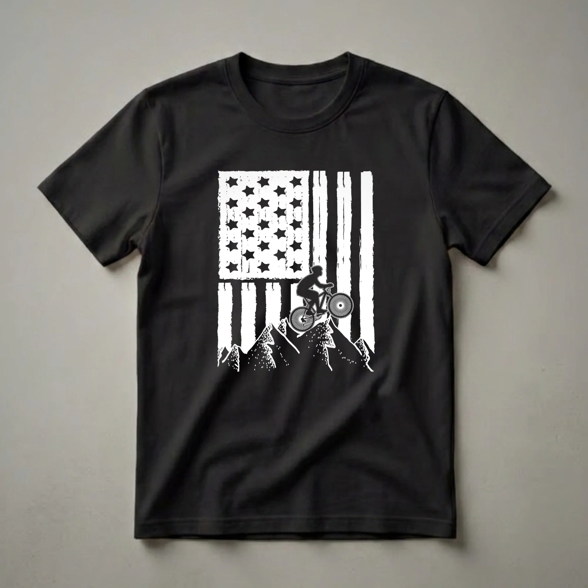Hover to zoom · tap to expand American Flag Mountain Biker Graphic T-Shirt for Outdoor Enthusiasts
