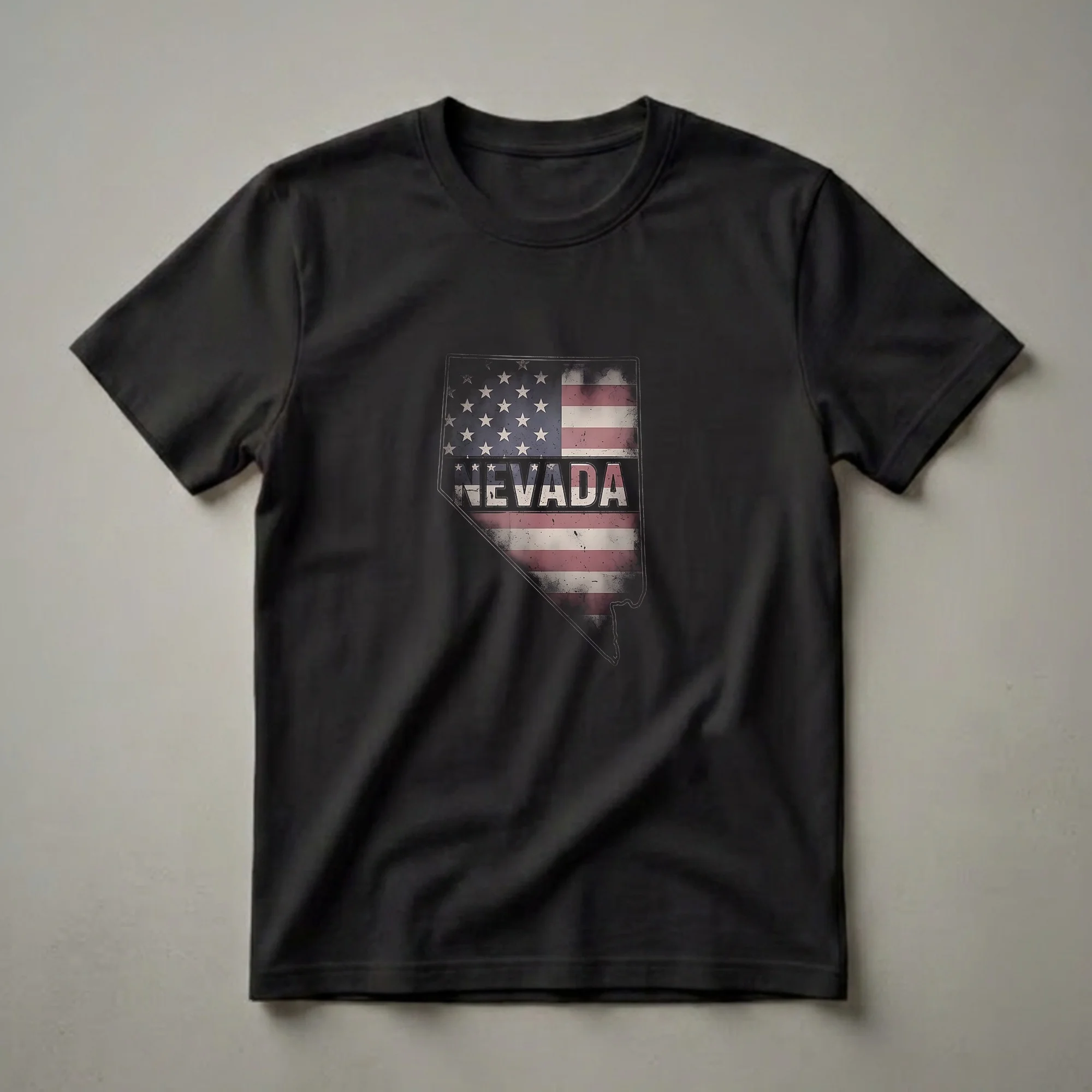 - Features a distressed American flag filling the outline of Nevada.