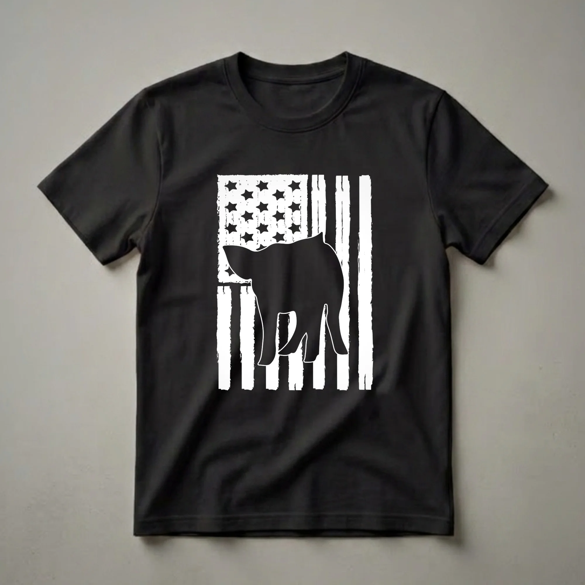 Farm animal enthusiasts who also hold a deep appreciation for their country will reach for this striking graphic tee. The design features a bold black silhouette of a pig, rendered in a classic, somewhat rounded form, positioned centrally against a distressed American flag. The flag itself is depicted with white stripes and a field of white stars, all rendered with a textured, worn appearance that suggests a vintage aesthetic. Pigs, known for their intelligence and social nature, are a cornerstone of many farms, contributing to agriculture and providing companionship. This shirt merges the iconic imagery of the Stars and Stripes with the beloved farm animal, creating a unique statement piece. It's a thoughtful gift for anyone who cherishes their connection to the land, farming heritage, or simply has a soft spot for these intelligent creatures. Wear this tee to casual gatherings, country fairs, or simply while tending to your own farm, showcasing your dual passions with pride. This t-shirt is a fantastic way to express patriotism and a love for farm life simultaneously.