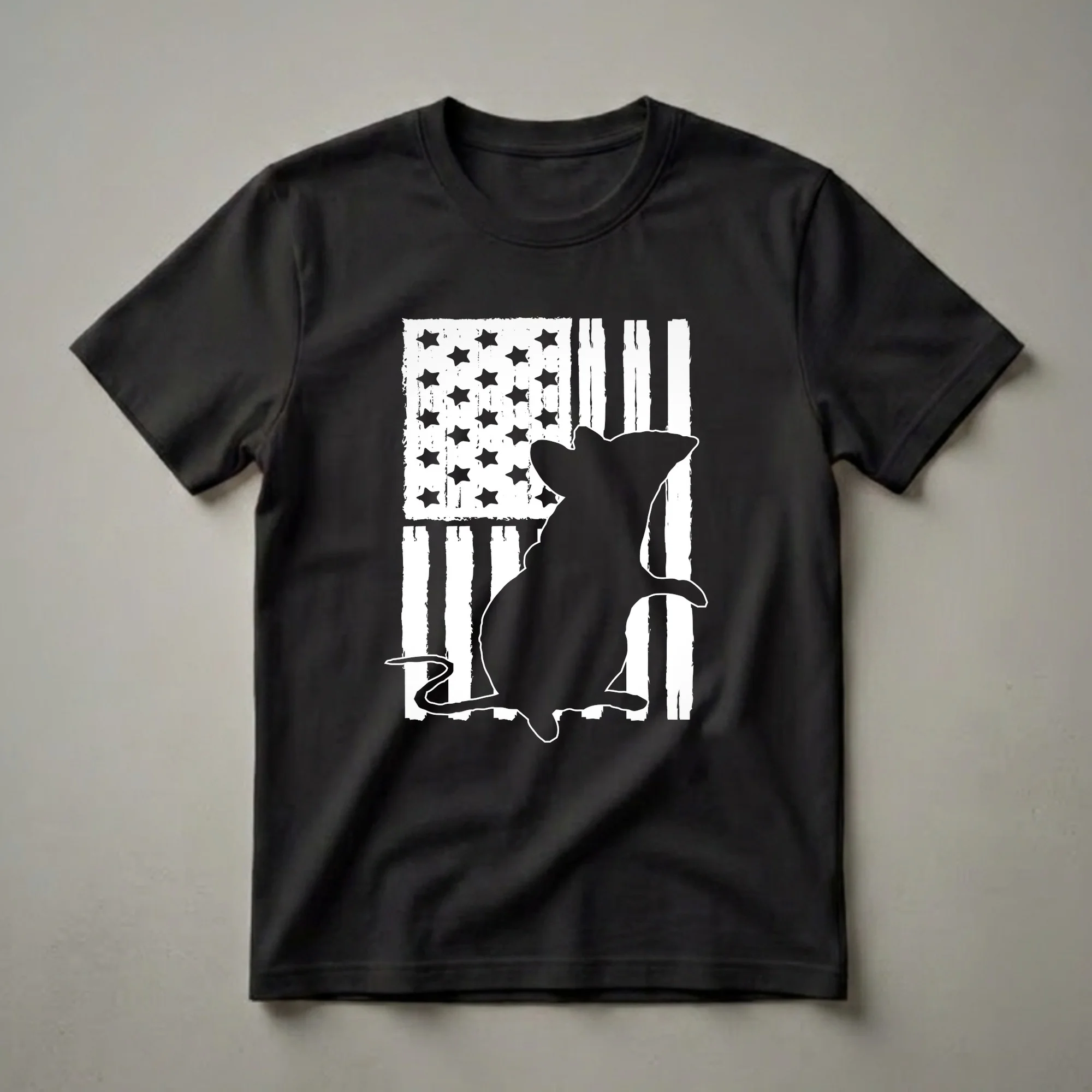 Mouse lovers and patriotic individuals will appreciate this striking graphic tee featuring a bold black silhouette of a rat against a distressed white American flag. The flag design incorporates classic vertical stripes and a field of stars, all rendered with a textured, worn effect that adds a vintage appeal. This shirt is a unique way for rodent admirers to express their love for their favorite small mammals while showcasing their national pride. The rat, often misunderstood, is depicted here with a sense of dignity, its tail curled and its posture alert. This t-shirt works well for anyone who has a soft spot for these intelligent creatures. It makes a thoughtful gift for a friend or family member who adores rats or mice, perhaps for a birthday or a patriotic holiday. Wear this eye-catching tee to casual gatherings, barbecues, or any event where you want to spark conversation and display your unique interests. It's a staple in the collection for those who appreciate a blend of Americana and animal appreciation.