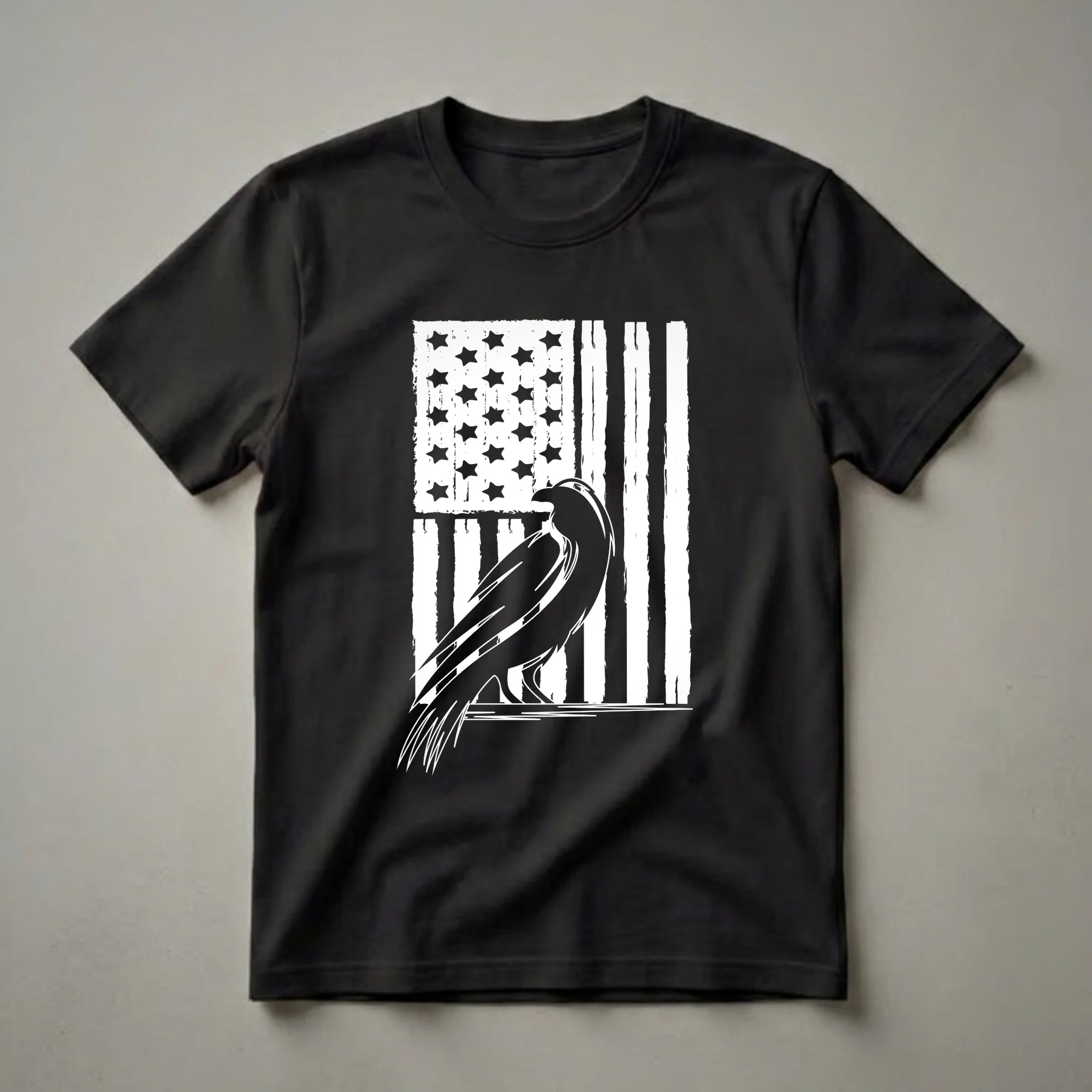 - Features a distressed American flag with a bold raven silhouette.