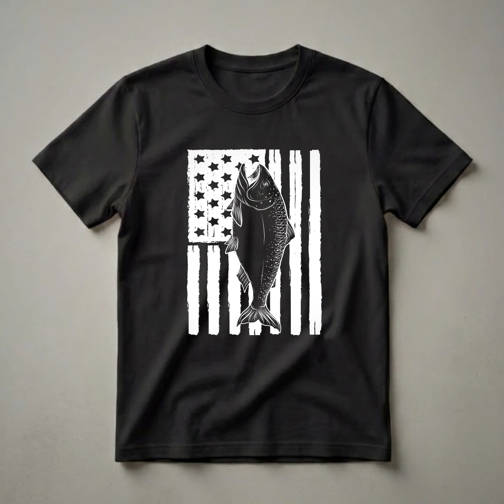 Anglers who appreciate the thrill of the catch will reach for this unique t-shirt. The design prominently features a dynamic salmon mid-leap, rendered in a bold, graphic style. Behind the fish, a distressed American flag provides a patriotic backdrop, with its iconic stripes and stars depicted with a textured, worn appearance. This tee is a clear statement for anyone who loves to fish, particularly those who target salmon, a species known for its powerful runs and challenging fight. Salmon are anadromous, meaning they migrate from saltwater to freshwater to spawn, making their life cycle as fascinating as the sport of catching them. This shirt works well for casual wear, fishing trips, or as a gift for the fisherman in your life. It’s a staple in the collection for any patriotic fishing enthusiast. Wear it to your next fishing excursion or to a casual gathering to showcase your passion for the sport and your country.
