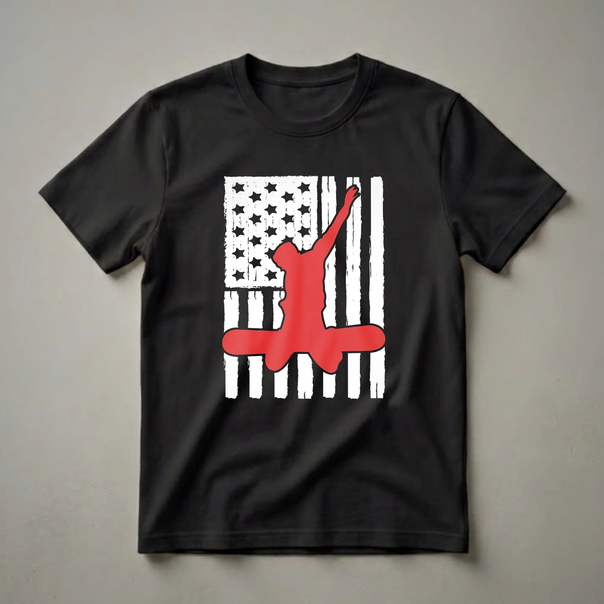 Snowboarders who embrace the thrill of carving down powdery slopes will appreciate this eye-catching t-shirt. The design features a bold red silhouette of a snowboarder captured in a dynamic pose, mid-air, against the backdrop of a distressed American flag. This graphic tee is a statement piece for anyone who loves the exhilaration of winter sports and wants to display their patriotic spirit. Snowboarding, a sport that originated in the 1960s, requires balance, agility, and a sense of adventure, much like the spirit embodied by the American flag. This shirt works well for individuals who spend their winters on the mountain, whether they are beginners or seasoned professionals. It makes a thoughtful gift for the snowboarder in your life, a thoughtful choice for birthdays, holidays, or just to show appreciation. Wear this shirt to the lodge, on casual outings, or while planning your next mountain getaway. It’s a staple in the collection for any winter sports enthusiast who wants to combine their passion with national pride.