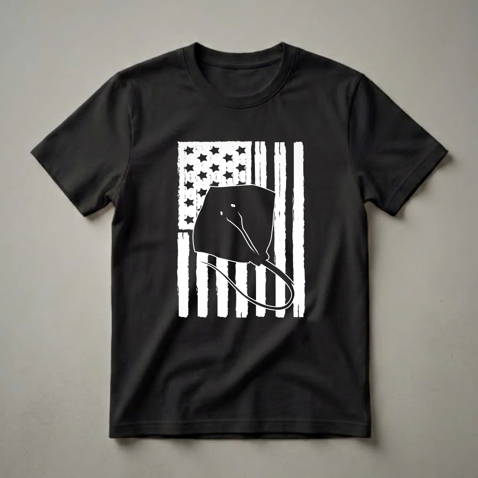 Anglers who appreciate the thrill of the catch and the pride of the USA will reach for this unique graphic tee. The design features a bold, black silhouette of a stingray, its distinctive shape and whip-like tail clearly visible, overlaid on a distressed American flag. The flag's stripes have a textured, brushstroke appearance, and the stars are rendered in solid black, creating a striking contrast against the white background. Stingrays, known for their cartilaginous skeletons and flattened bodies, inhabit warm, shallow coastal waters around the world, making them a common sight for saltwater anglers. This shirt is a fantastic way for fishermen to express their passion for the sport and their patriotism. It makes a thoughtful gift for the dad who spends his weekends on the water or the friend who loves to talk about their latest fishing adventure. Wear this tee to your next fishing trip, to a casual barbecue, or while watching the game, celebrating your love for both the open water and the red, white, and blue.