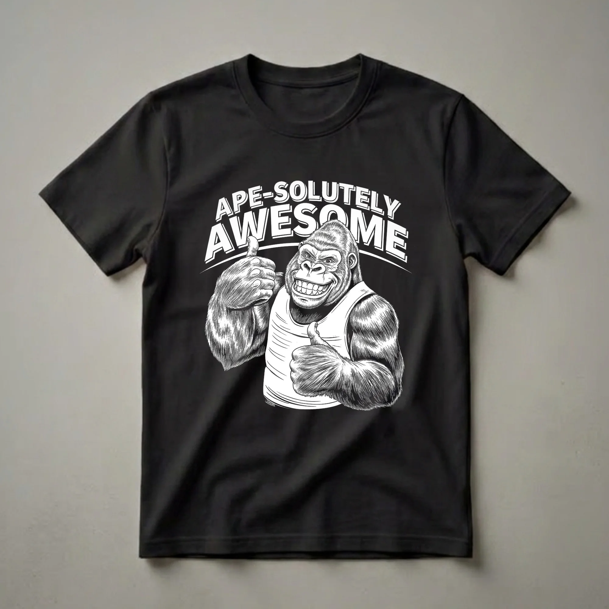 Gorillas, known for their immense strength and social structures, are often seen as symbols of power and intelligence. This striking graphic tee features a detailed black and white illustration of a smiling gorilla, complete with a tank top and two enthusiastic thumbs-up gestures. The bold text above reads 'APE-SOLUTELY POSITIVE,' playing on words to deliver a humorous and uplifting message. This t-shirt is a go-to tee for men who appreciate witty animal humor and enjoy making a statement. It's a thoughtful gift for friends who have a great sense of humor or anyone who admires these magnificent primates. Wear this shirt to casual gatherings, game nights, or just when you want to bring a smile to people's faces. The detailed linework and expressive face of the gorilla make this a truly eye-catching piece of apparel for any humor enthusiast.