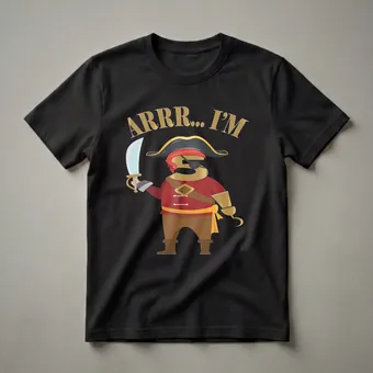 Let your little swashbuckler celebrate turning five with this fun pirate t-shirt featuring a cool buccaneer design.For the young buccaneer turning five, this 'Arrr I'm 5 Years Old' pirate t-shirt is ready for adventure. The graphic showcases a cartoon pirate character, with the bold number '5' forming its torso. This pint-sized pirate sports a classic tricorn hat with a red bandana, a black eye patch, and a fierce red coat adorned with white buttons and a brown belt with a diamond buckle. A golden sash adds a touch of flair, while brown pants and boots complete the seafaring ensemble. In one hand, the pirate clutches a gleaming cutlass, and a golden hook replaces the other hand, ready for swashbuckling action. This tee is a fantastic way for any 5-year-old boy to celebrate his special day, whether at a pirate-themed party or just playing pretend. It makes a thoughtful gift for any child who dreams of sailing the high seas and finding buried treasure. This shirt is a go-to tee for birthday celebrations, playdates, or any day a young pirate wants to show off his age with a bit of swagger. Pirates have long captured the imagination, with tales of adventure, treasure maps, and daring escapades, making this theme a timeless favorite for young children.