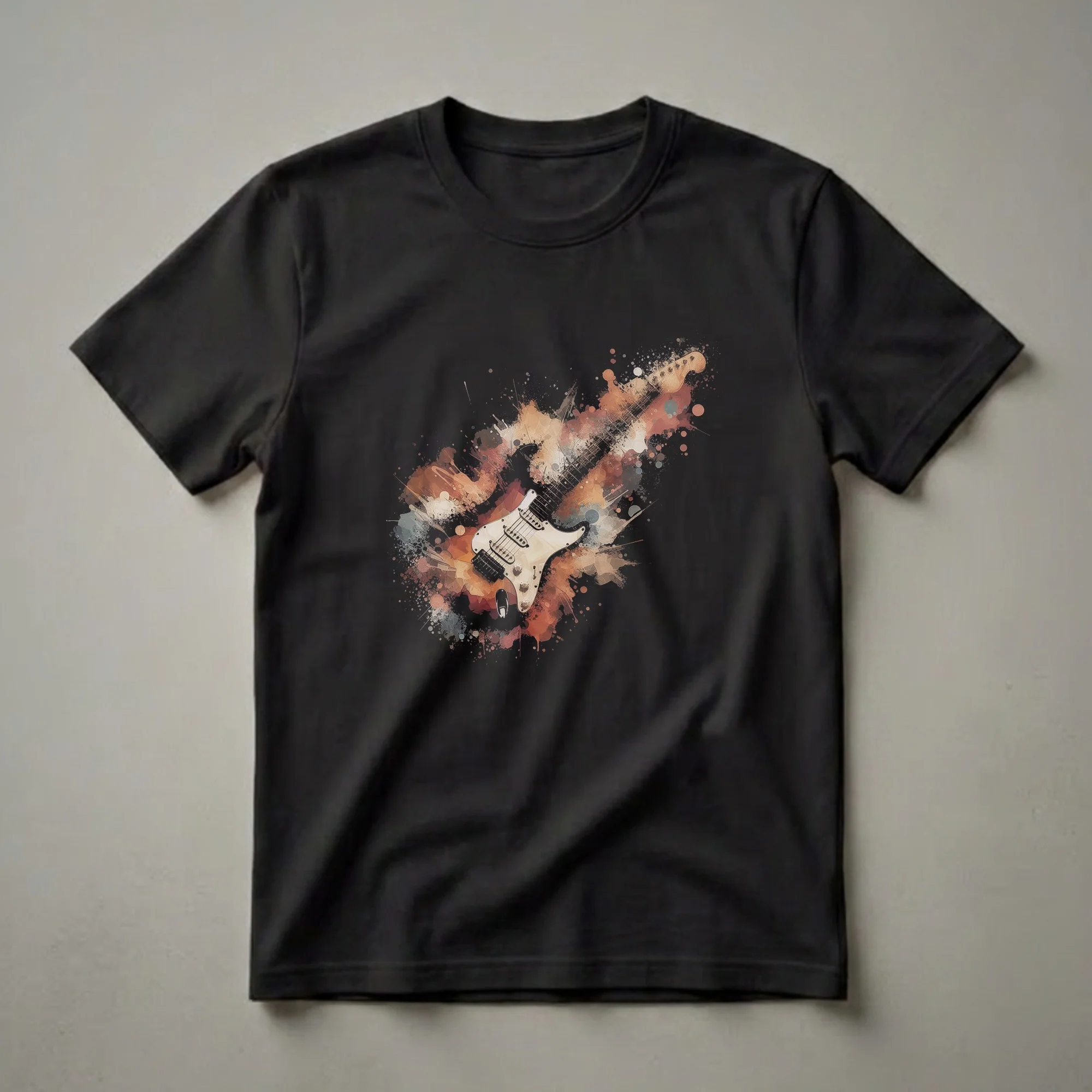Musicians and guitar enthusiasts will appreciate the artistic flair of this electric guitar t-shirt. The design features a white electric guitar, reminiscent of a Fender Stratocaster, rendered in a dynamic watercolor splash art style. Splatters and strokes of warm browns, oranges, and grays burst around the instrument, creating a sense of movement and energy. This graphic tee is a statement piece for anyone who loves to play or listen to music. Electric guitars, like the one depicted, revolutionized popular music in the mid-20th century, offering new sonic possibilities for genres from blues to rock and beyond. This shirt works well for guitarists, music students, or anyone who appreciates unique artistic apparel. It makes a thoughtful gift for the guitarist in your life who wants to express their musical identity. Wear this eye-catching tee to band practice, concerts, or casual outings to share your love for the instrument.