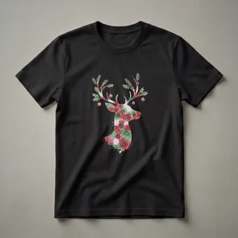 Families looking to coordinate their holiday outfits will reach for this artistic reindeer t-shirt. The design features a striking watercolor silhouette of a reindeer's head, rendered in festive shades of red and green with a playful splatter effect. Its antlers are adorned with traditional Christmas elements, including sprigs of pine needles, holly leaves with red berries, and small, decorative Christmas ornaments that evoke the spirit of the season. This unique graphic tee captures the whimsical charm of winter wildlife, bringing a touch of artistic flair to your festive celebrations. Reindeer are iconic symbols of the North, often associated with Santa's sleigh and the magic of Christmas Eve, making this shirt a fitting choice for holiday gatherings, Christmas morning photos, or even a cozy night by the fire. This shirt makes a thoughtful gift for any family member who enjoys unique holiday designs and wants to create memorable matching moments during the Christmas season. Wear it to your next family holiday party or as part of your festive Christmas card photo shoot.