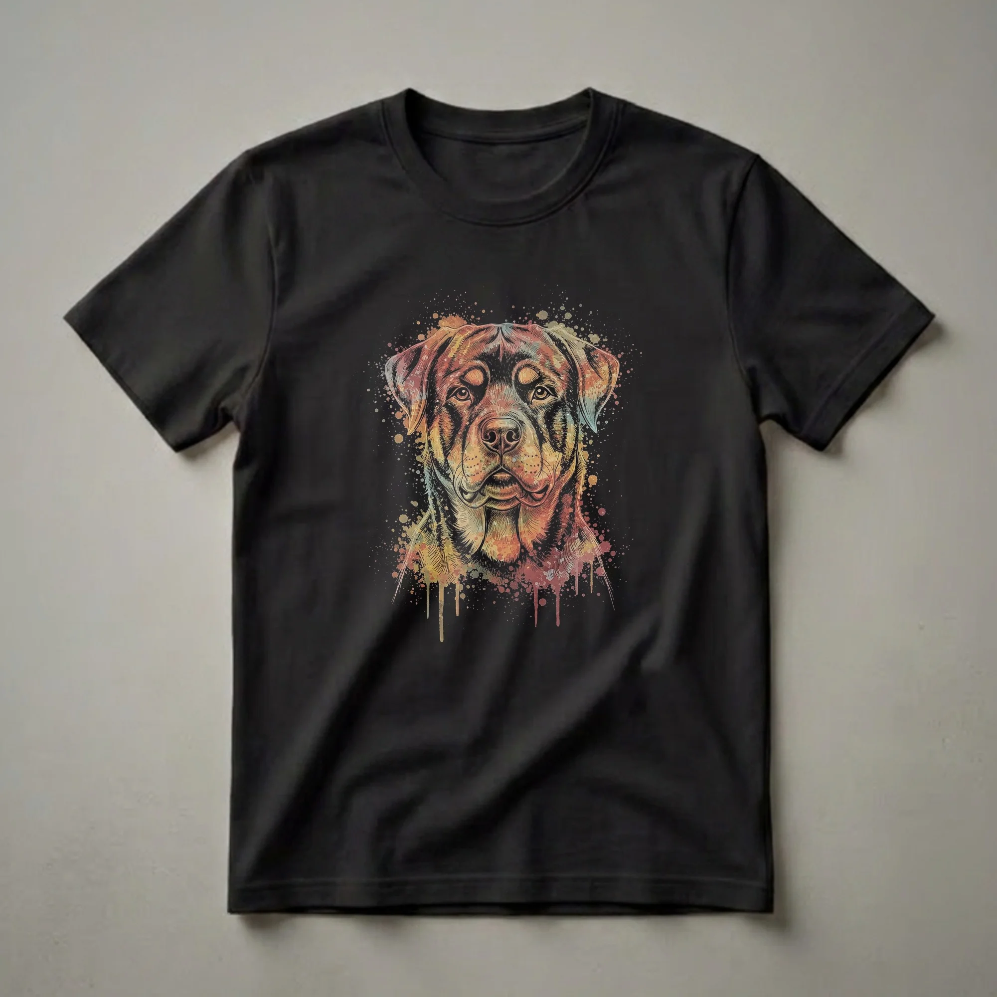 Rottweiler owners who appreciate the breed's loyal and protective nature will reach for this striking graphic tee. The design features a detailed, artistic drawing of a Rottweiler's head, rendered in a vibrant watercolor style with a dynamic splatter paint effect. This eye-catching artwork captures the breed's powerful build and gentle expression, making it a standout piece for any dog enthusiast. Rottweilers, originally from Germany, are known for their strength and confidence, often serving as capable working dogs. This t-shirt is a wonderful way to celebrate your connection with these magnificent animals. It makes a thoughtful gift for the Rottweiler mom or dad in your life, a thoughtful choice for casual outings, dog park visits, or simply relaxing at home. Wear this shirt to express your admiration for this noble breed and spark conversations with fellow dog lovers.